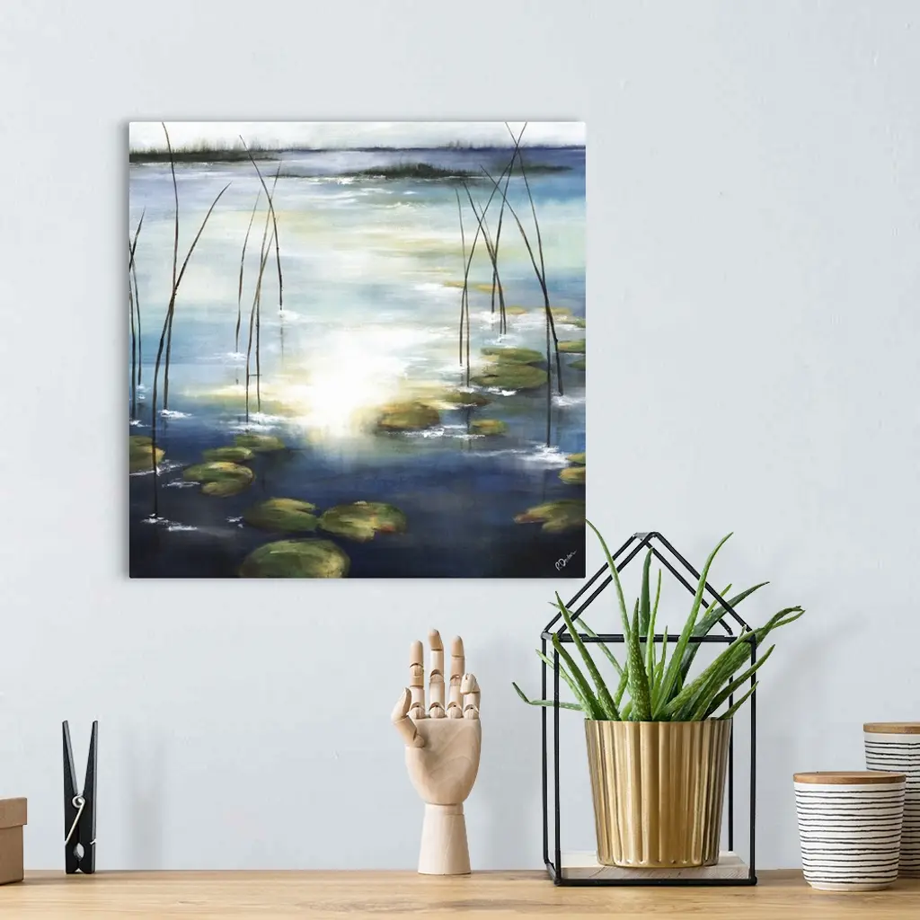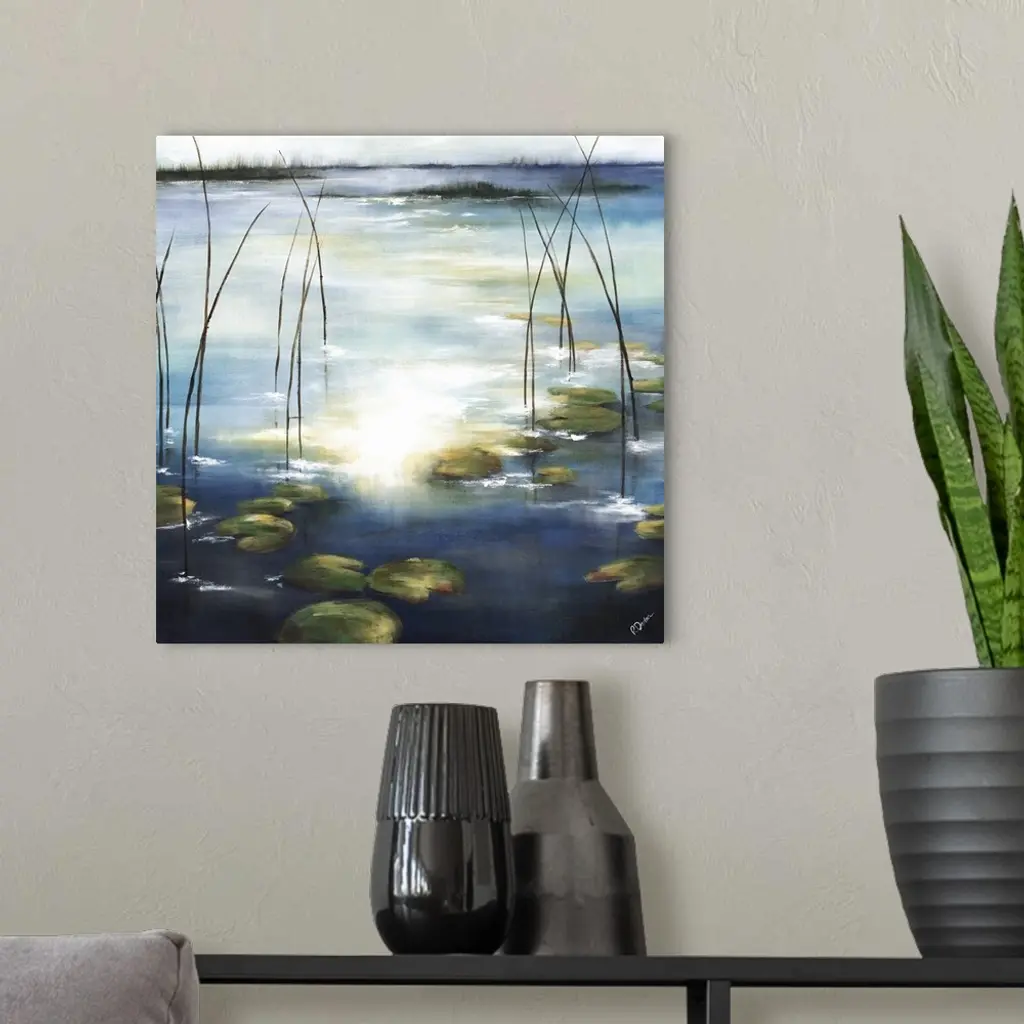 Contemporary painting of lily pads in a pond with the sun reflecting on the water.