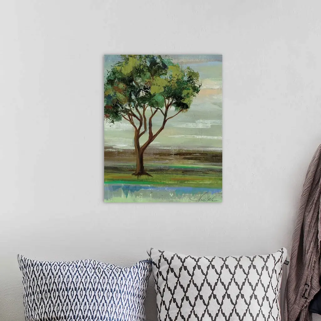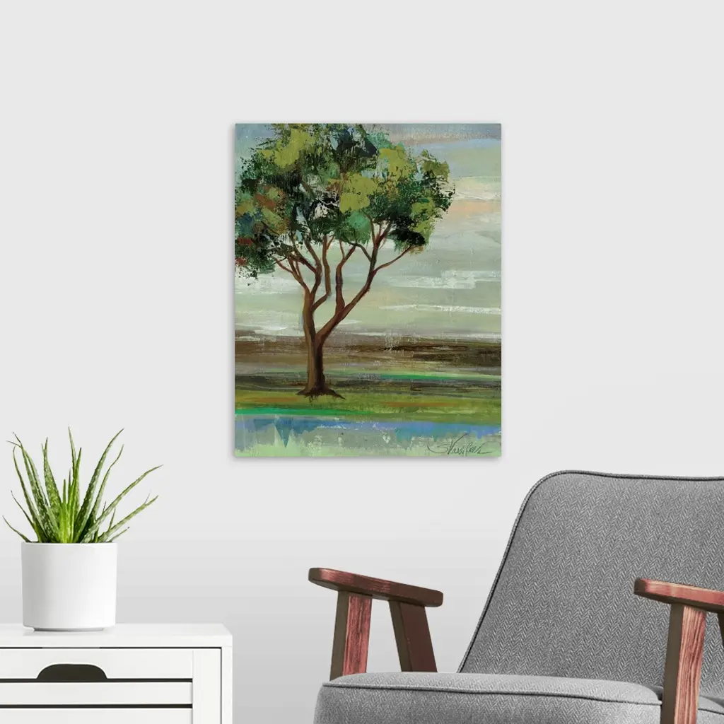Contemporary artwork of a tree with leafy green branches in a field.