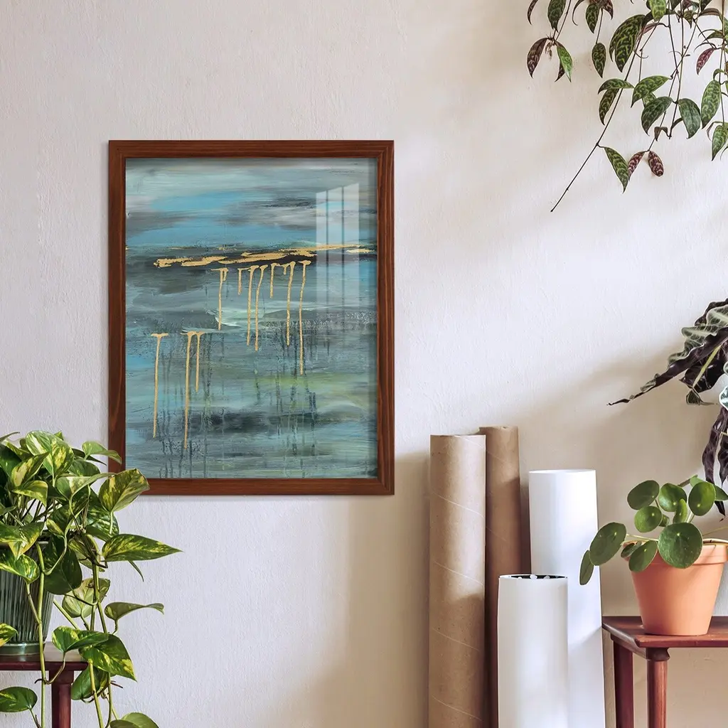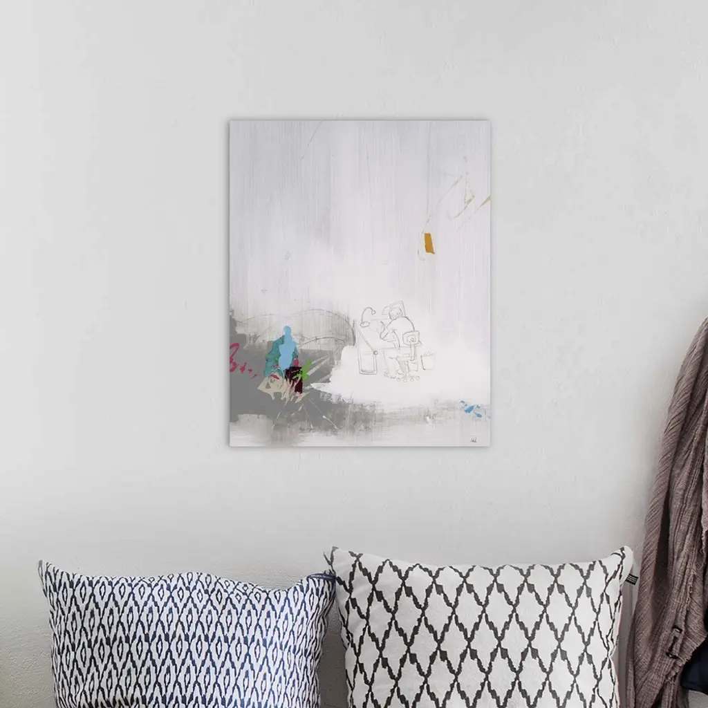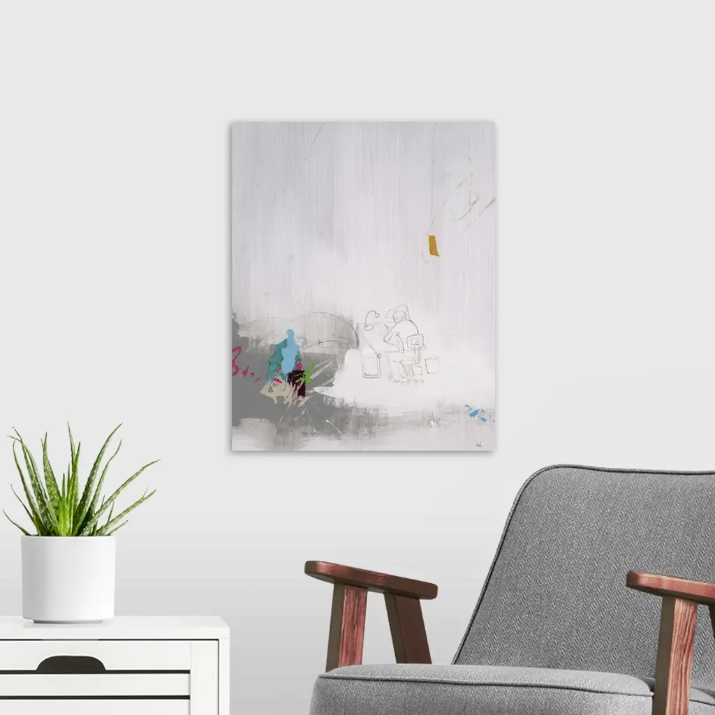 Contemporary abstract painting with hints of color against a neutral background, with a pencil sketch of a man a drawing table in the middle.