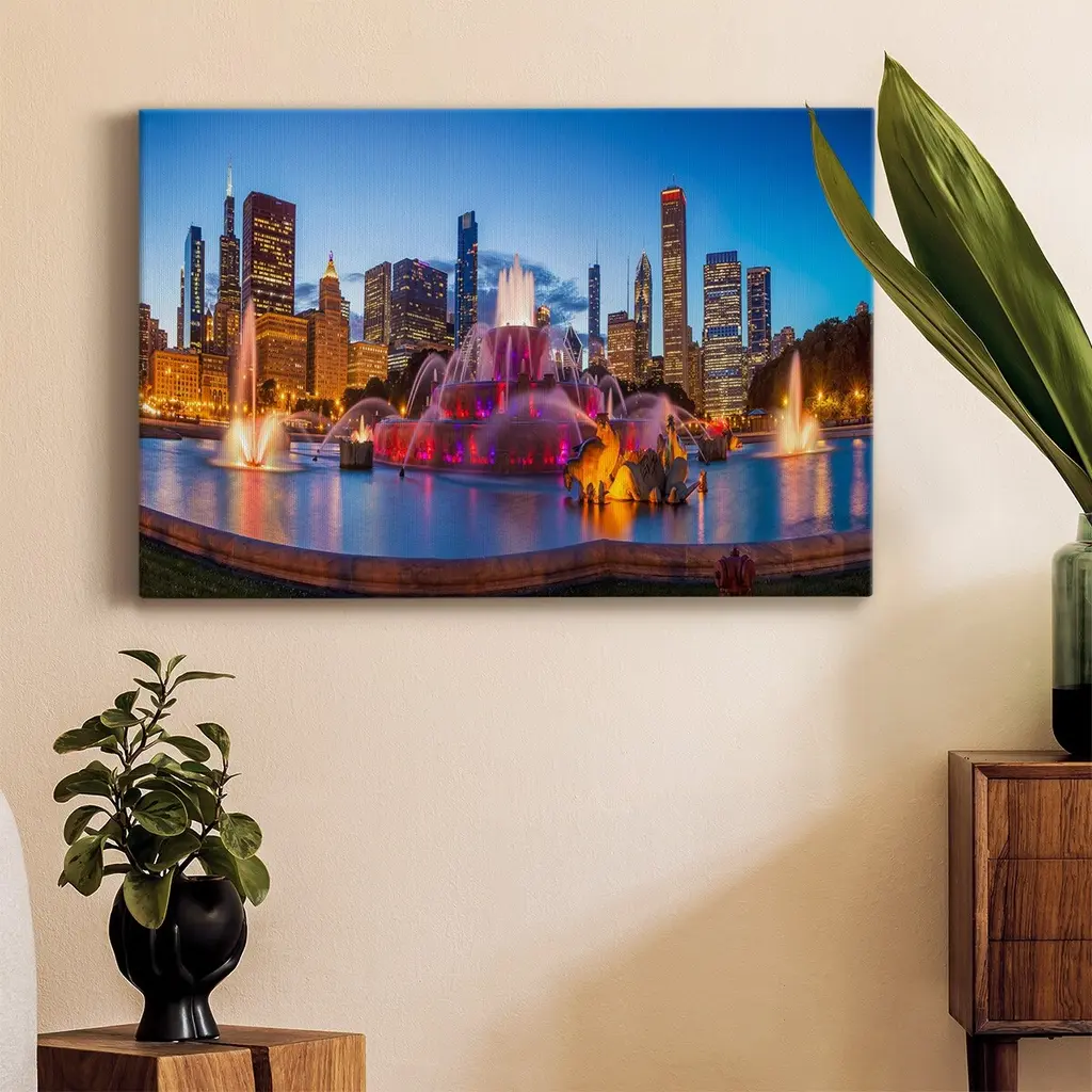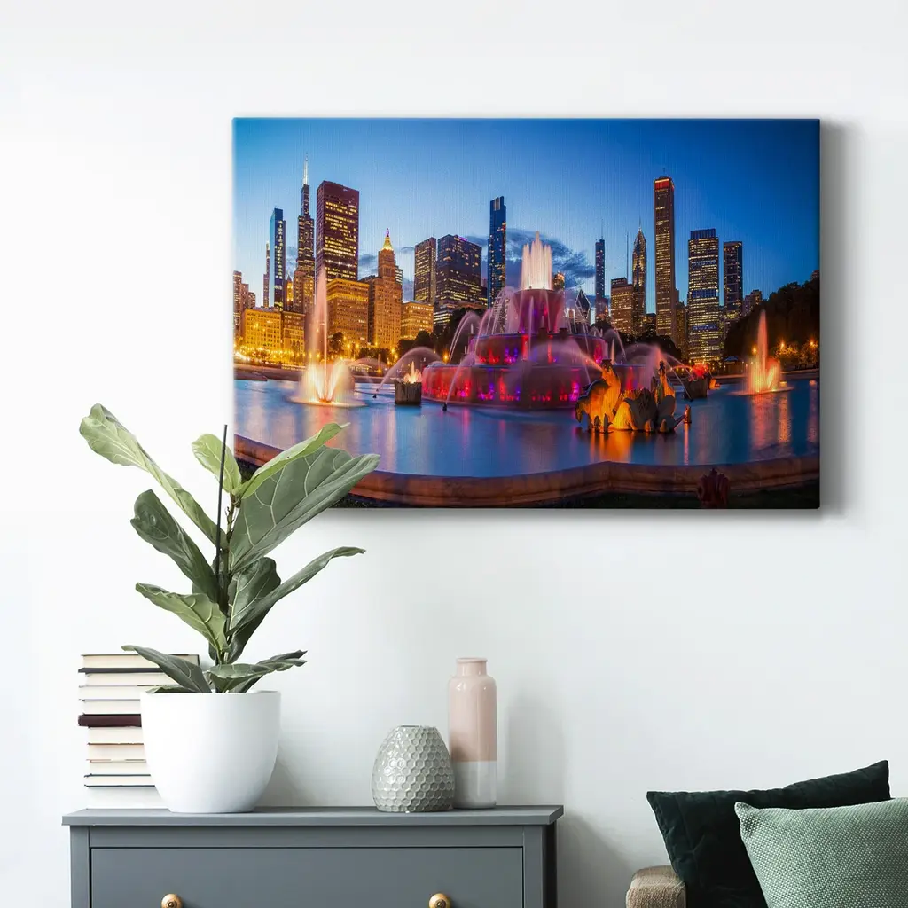 Downtown Chicago At Night Premium Gallery Wrapped Canvas - Ready to Hang A premium hand stretched gallery wrapped canvas print created to last. Featuring a beveled a solid wood stretcher bar, each piece comes ready to hand 6 SIZES AVAILABLE 8''X12'' - Overall Size 12''X18'' - Overall Size 18''X27'' - Overall Size 24''x36'' - Overall Size 32''x48'' - Overall Size 40''x60'' - Overall Size Each piece is made to order. Built to Last Each piece comes ready to hang Solid wood stretcher Fade and Water resistant Made domestically