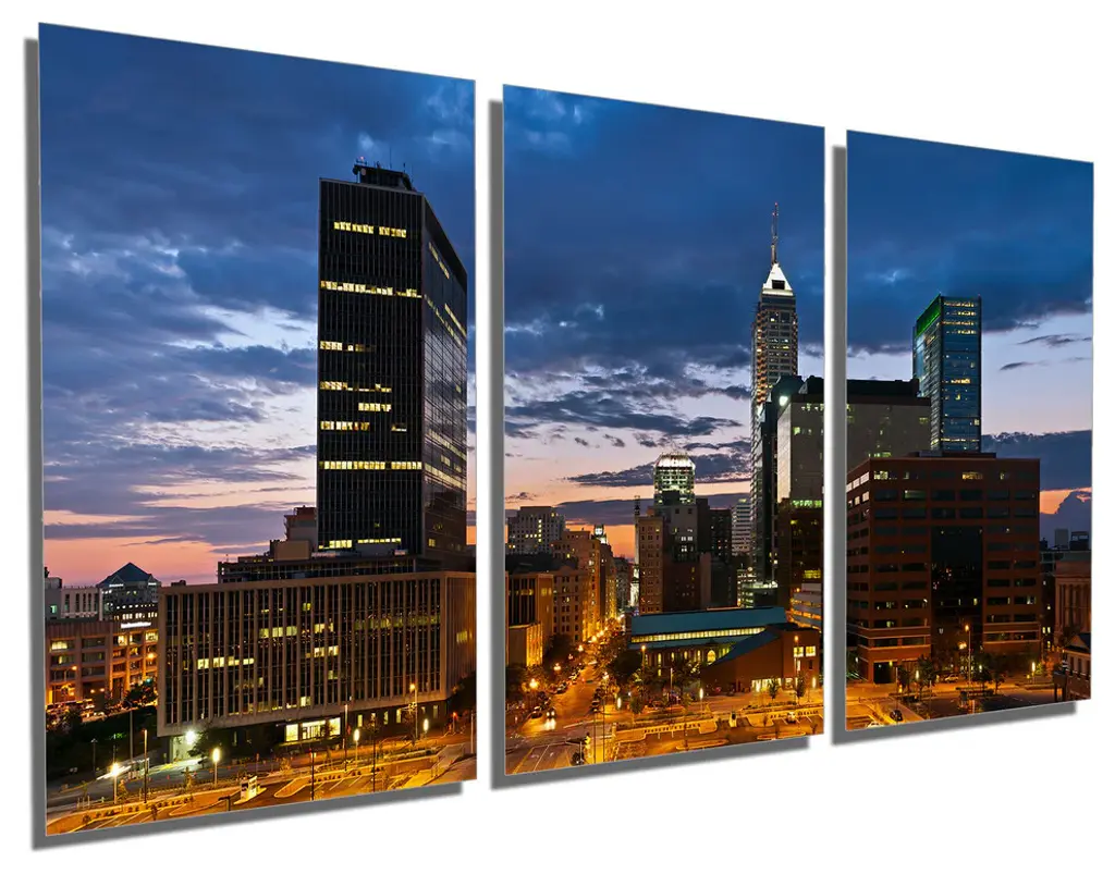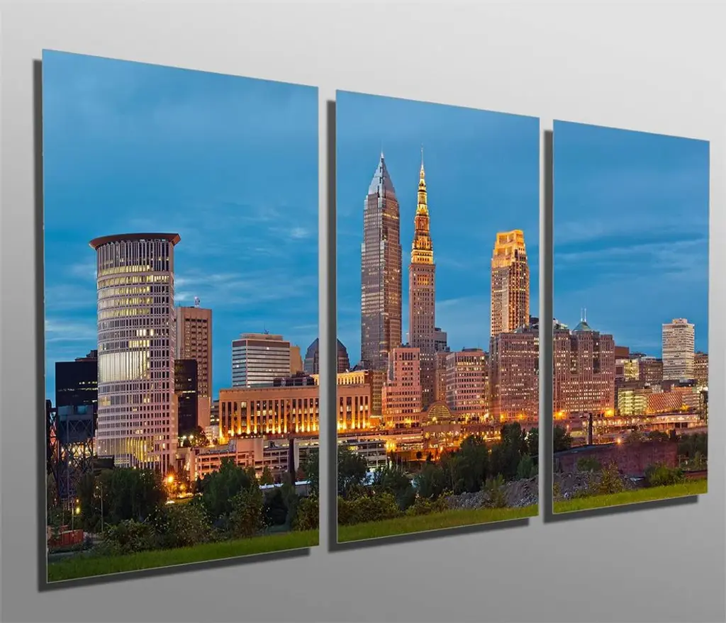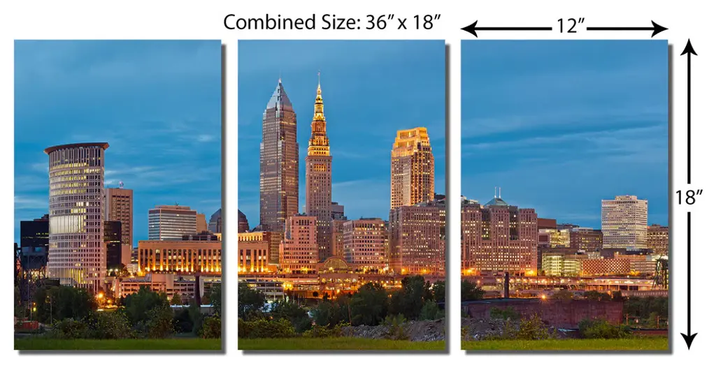 36"œ x 18"œ total size. Ready To Hang! (3 pieces - 12"œ x 18"œ each). 3 Panel Split (Triptych) Metal Print of Downtown Cleveland, Ohio skyline at dusk. Modern metal wall art for home or office wall decor & interior design. Printed on Luxurious, HD aluminum glossy metal panels. Multi panel art.. HD aluminum panels. Metal print wall art. Includes Shadow Wall Mount on the back.• Aluminum Metal Wall Art• Made in USA• Ready to hang - No assembly required• Shadow mount hardware on the back• 0.045"œ thick HD Aluminum Panels• Scratch resistant, glossy finish• Superb color clarity, luxurious prints• Epson printing process• For indoor or moisture rich environment use• Easy to clean. Gently wipe with microfiber cloth.
