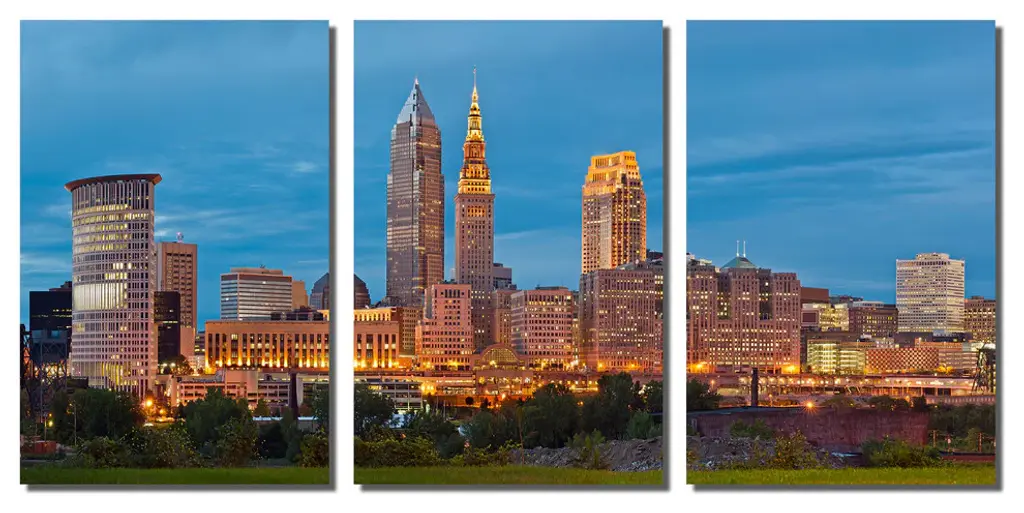 48"œ x 24"œ total size. Ready To Hang! (3 pieces - 16"œ x 24"œ each). 3 Panel Split (Triptych) Metal Print of Downtown Cleveland, Ohio skyline at dusk. Modern metal wall art for home or office wall decor & interior design. Printed on Luxurious, HD aluminum glossy metal panels. Multi panel art.. HD aluminum panels. Metal print wall art. Includes Shadow Wall Mount on the back.• Aluminum Metal Wall Art• Made in USA• Ready to hang - No assembly required• Shadow mount hardware on the back• 0.045"œ thick HD Aluminum Panels• Scratch resistant, glossy finish• Superb color clarity, luxurious prints• Epson printing process• For indoor or moisture rich environment use• Easy to clean. Gently wipe with microfiber cloth.
