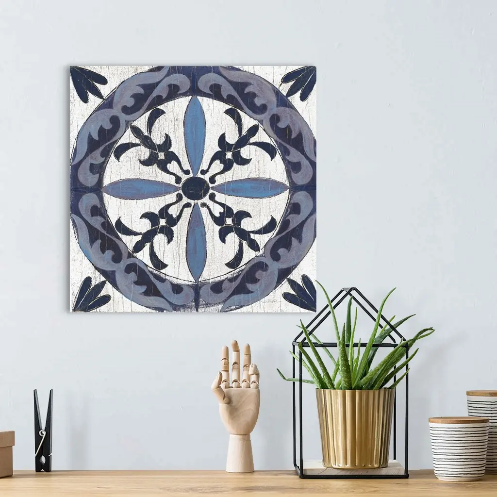 Square abstract painting of a symmetric indigo and white tile-like design.