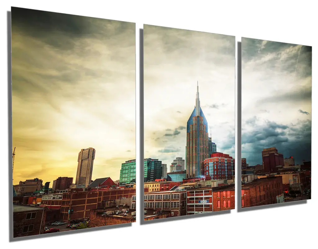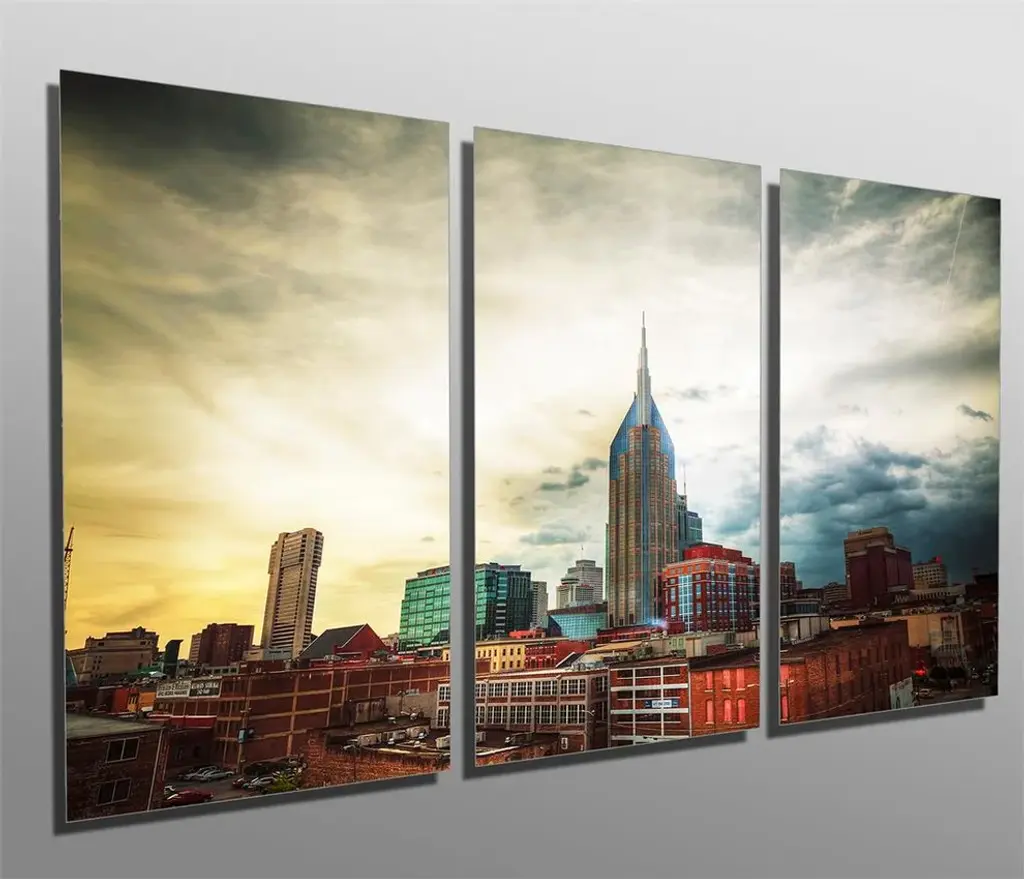 60"œ x 30"œ total size. Ready To Hang! (3 pieces - 20"œ x 30"œ each). 3 Panel Split (Triptych) Metal Print featuring Downtown Nashville, Tennessee cityscape in the evening. Modern metal wall art for home or office wall decor & interior design. Printed on Luxurious, HD aluminum glossy metal panels. Multi panel art.. HD aluminum panels. Metal print wall art. Includes Shadow Wall Mount on the back.• Aluminum Metal Wall Art• Made in USA• Ready to hang - No assembly required• Shadow mount hardware on the back• 0.045"œ thick HD Aluminum Panels• Scratch resistant, glossy finish• Superb color clarity, luxurious prints• Epson printing process• For indoor or moisture rich environment use• Easy to clean. Gently wipe with microfiber cloth.