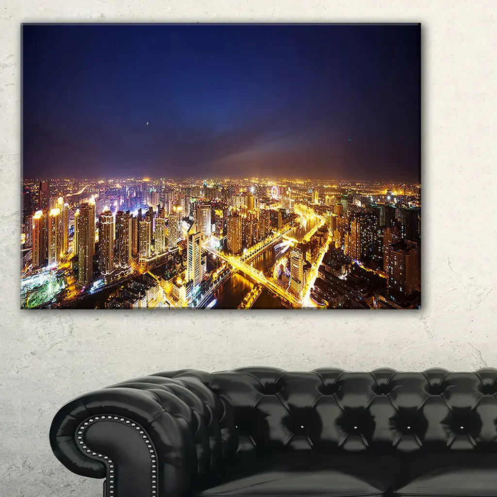The Downtown Nighttime Panorama canvas art print is sure to make an impression on anyone who sees it. This artwork is gallery wrapped around a 1-inch solid wood frame and arrives carefully packaged and entirely ready to hang on the wall. Design Art only uses the highest resolution and pigments to ensure a crisp colorful print that is never faded or pixelated. This artwork is sure to be a conversation starter in any home or office.