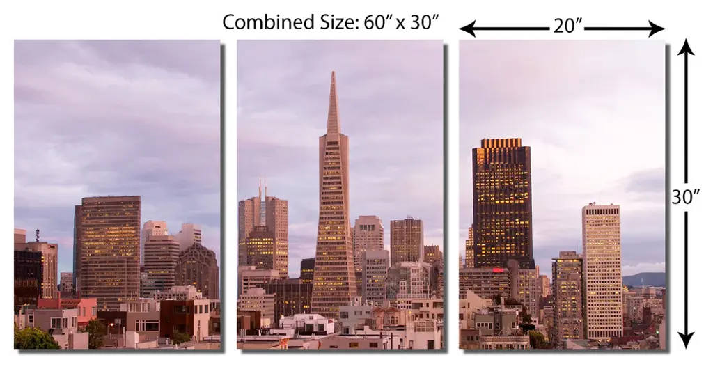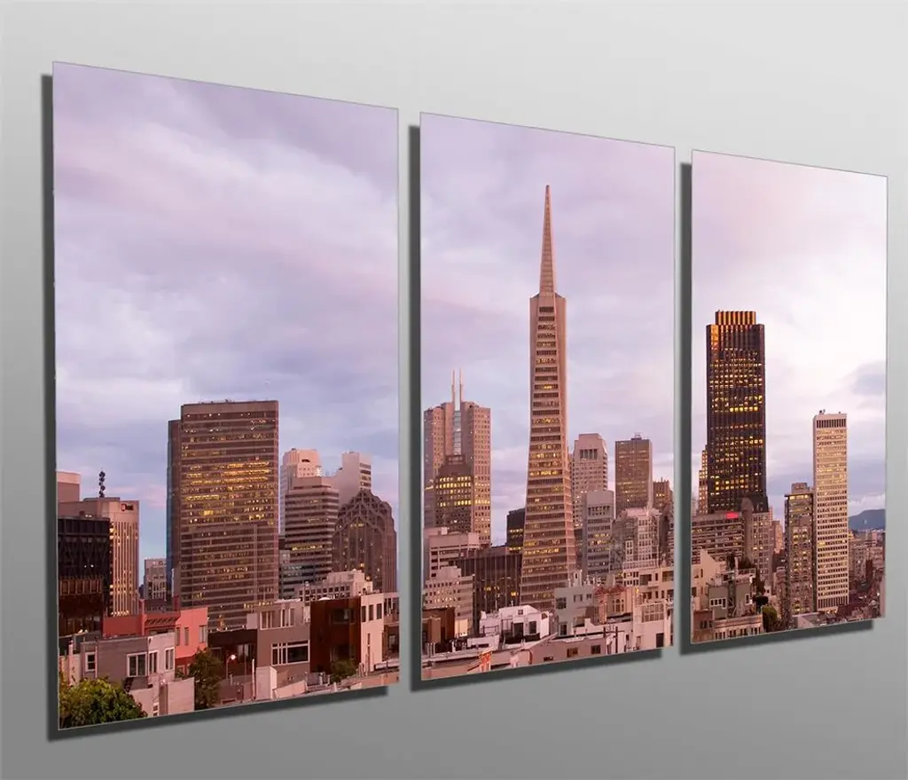 60"œ x 30"œ total size. Ready To Hang! (3 pieces - 20"œ x 30"œ each). 3 Panel Split (Triptych) Downtown San Francisco skyline Metal Print. Modern metal wall art for home or office wall decor & interior design. Printed on Luxurious, HD aluminum glossy metal panels. Multi panel art.. HD aluminum panels. Metal print wall art. Includes Shadow Wall Mount on the back.• Aluminum Metal Wall Art• Made in USA• Ready to hang - No assembly required• Shadow mount hardware on the back• 0.045"œ thick HD Aluminum Panels• Scratch resistant, glossy finish• Superb color clarity, luxurious prints• Epson printing process• For indoor or moisture rich environment use• Easy to clean. Gently wipe with microfiber cloth.