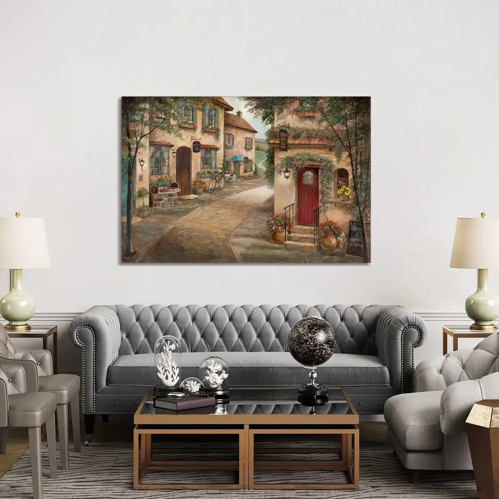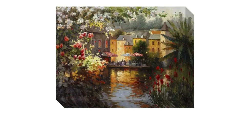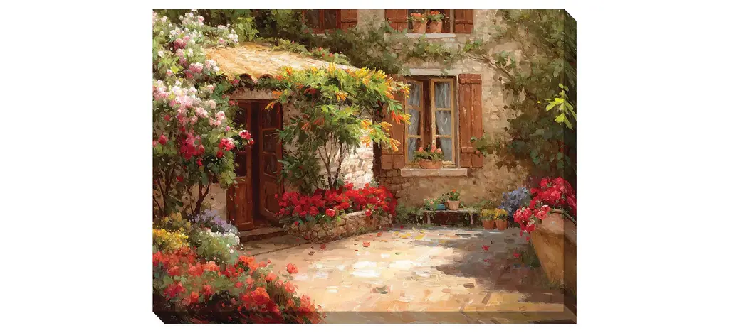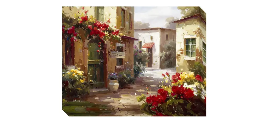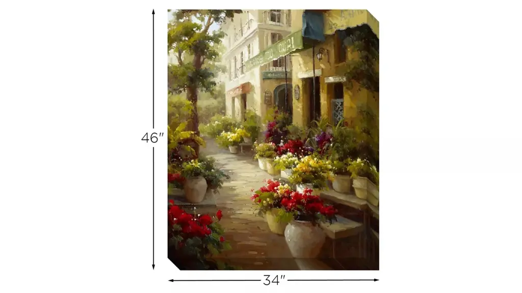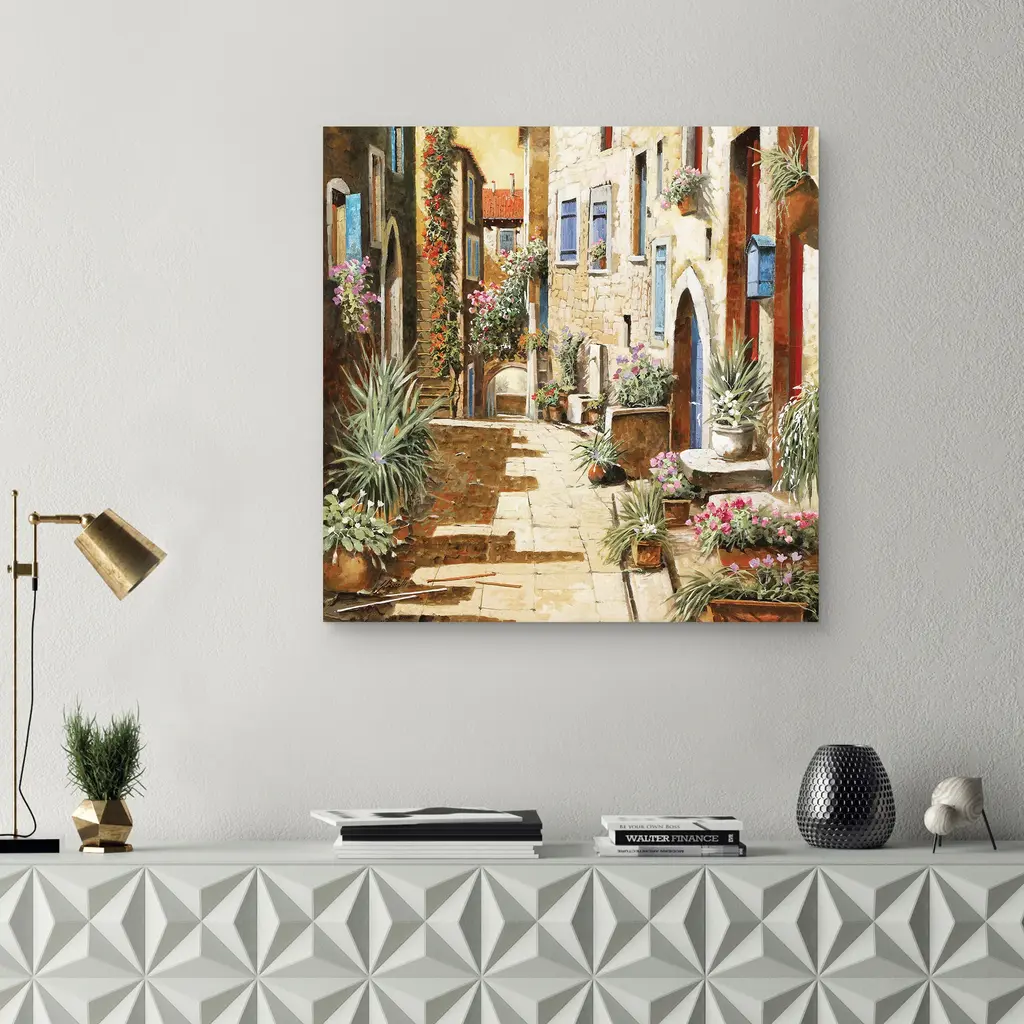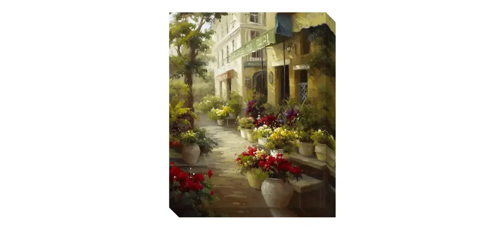This Downtown wall art depicts a romantic scene full of old-world charm. Its colorful flowers and play of light and shadows evokes a dreamy quality that will enrich any space.