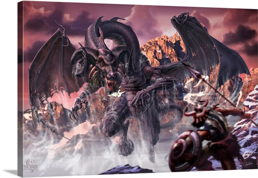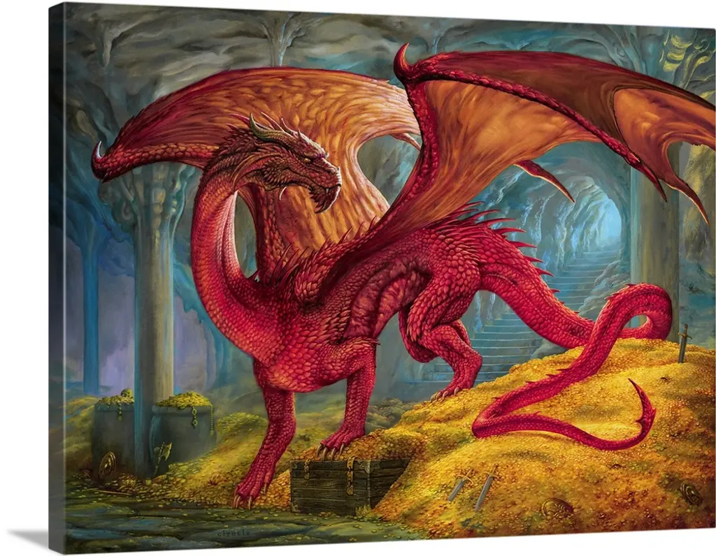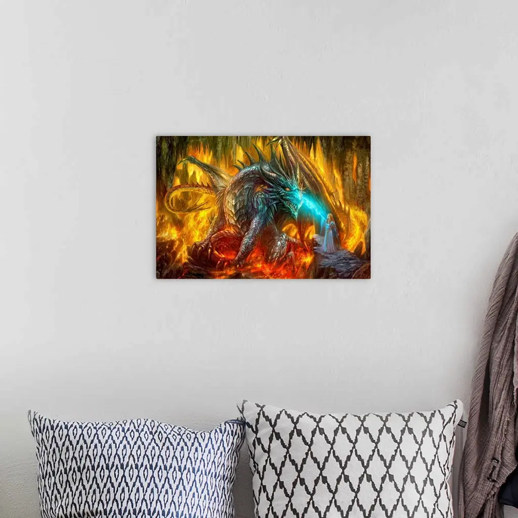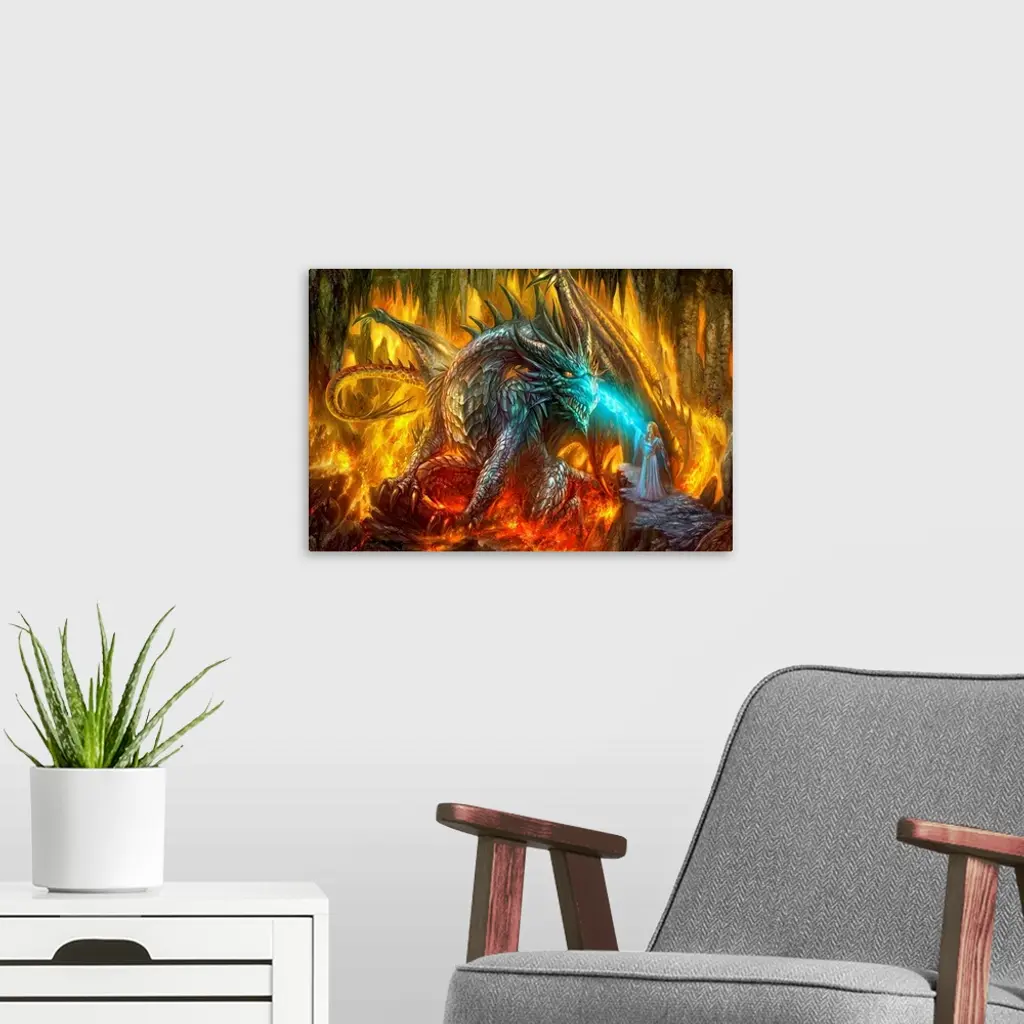 Exciting fantasy artwork of a horned, fire-breathing dragon and a sorceress, deep in a cave filled with lava and stalactites.