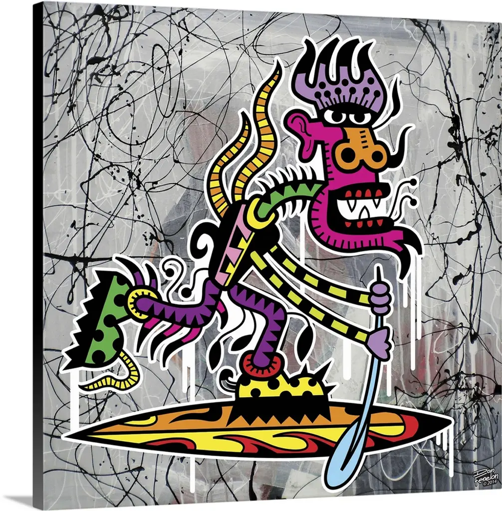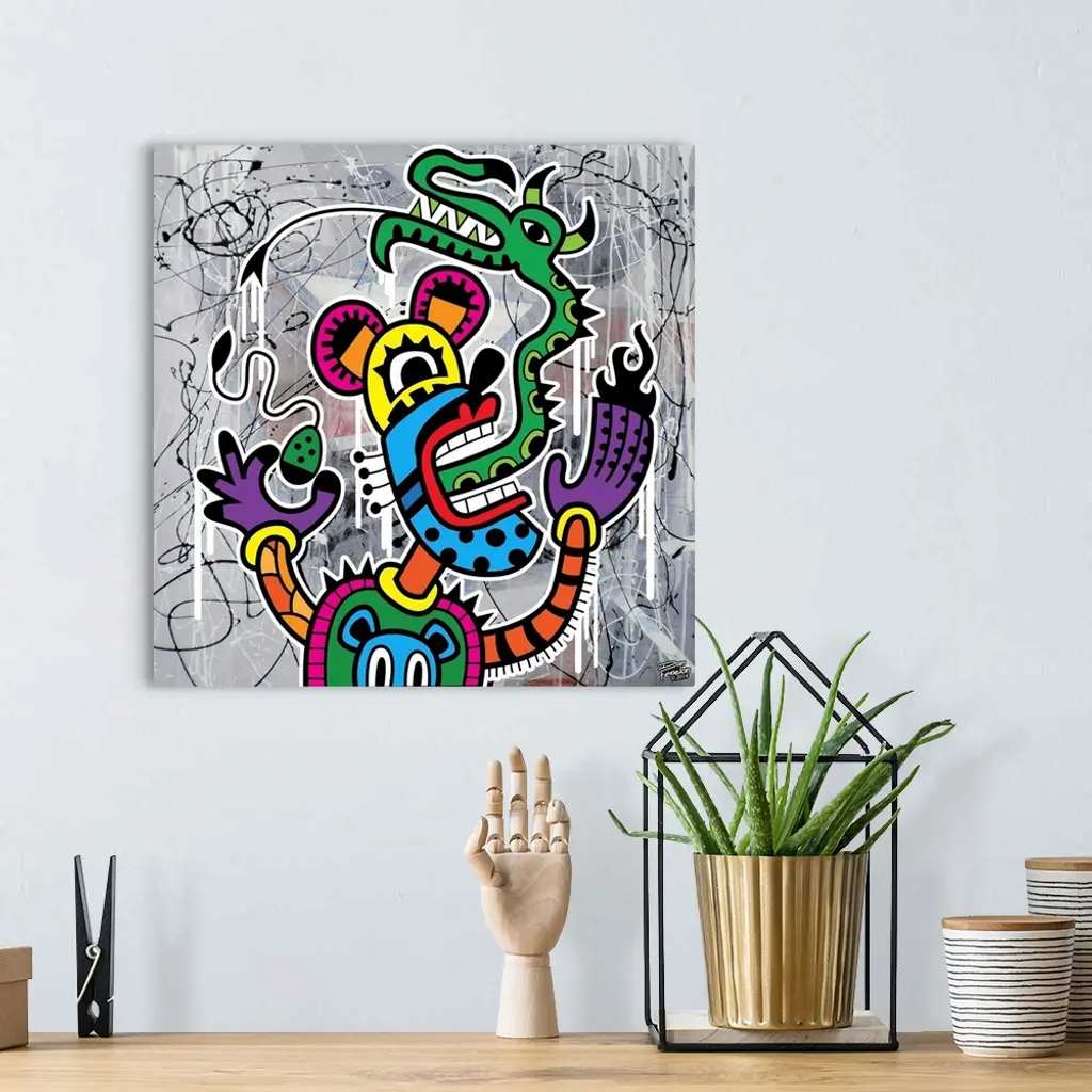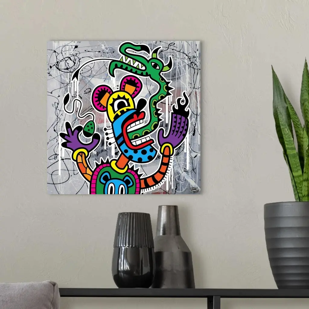 Contemporary painting of a colorful and decorative mouse figure with a green dragon for a tongue, against an abstract background.