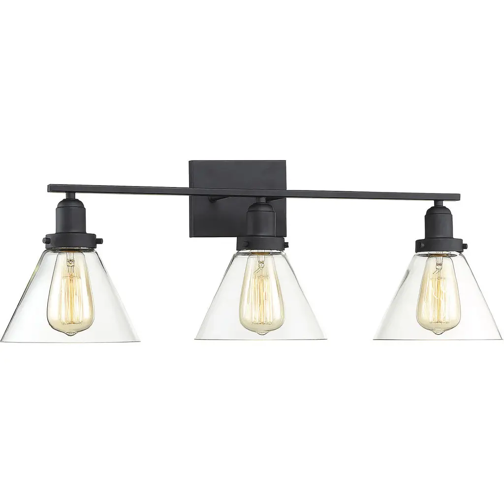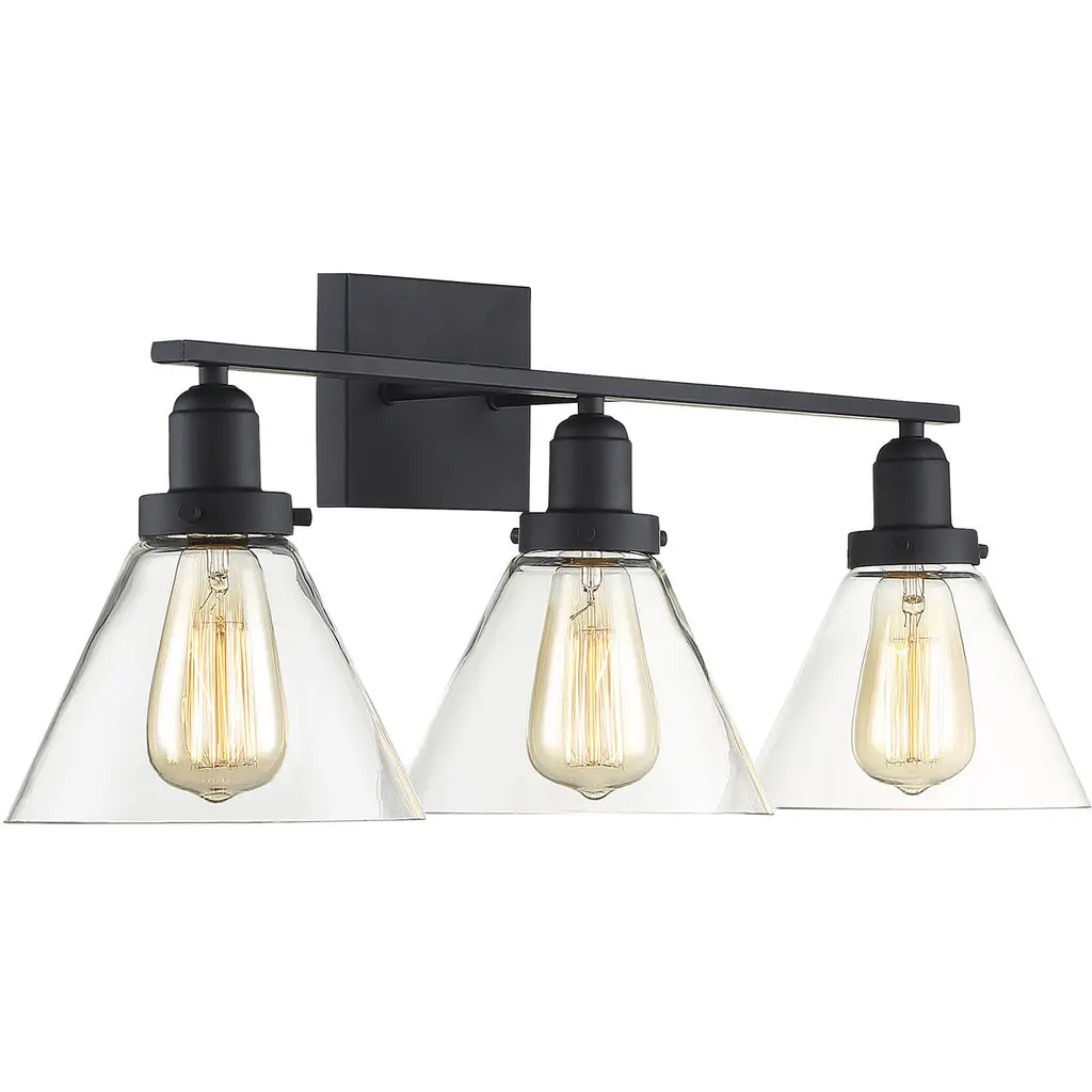 This Savoy House Drake 3-light bath bar has an alluringly simple style with a few choice hardware details and shades of clear glass. It may be mounted as either uplight or downlight. Bath bar lights are a classic choice for illuminating vanity mirrors in bathrooms big and small. Because the bulbs are exposed, try using stylized bulbs (not included) such as Edison for a different look The matte black finish can be paired with black hardware or mixed with hardware in other fixtures. Add Drake to industrial, transitional or contemporary rooms for a bold look. When you choose a Savoy House lighting fixture, you can be certain youve selected a piece that will withstand the test of time.