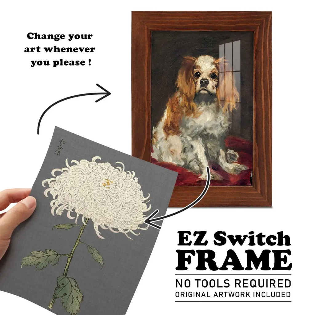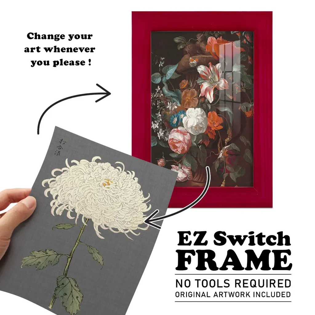 Dramatic Ivory Mums II -EZ SWITCH Framed Print w/glass-Cherry Red A delightful, framed print. Featuring a solid wood frame with real wood glass. This premium print is giclee quality. In addition, every frame features a removable back and table top stand. This allows you to change your art in the future or to just stand the art on a table for a new look. We are sure you'll enjoy our new series of EZ SWITCH Framed Art. Solid Wood Frame Real Glass Removable / Replaceable Art Built in Tabletop Stand Sizes range from 4x6 up to 12x15 - buy just one or pair them up as sets as you see fit.