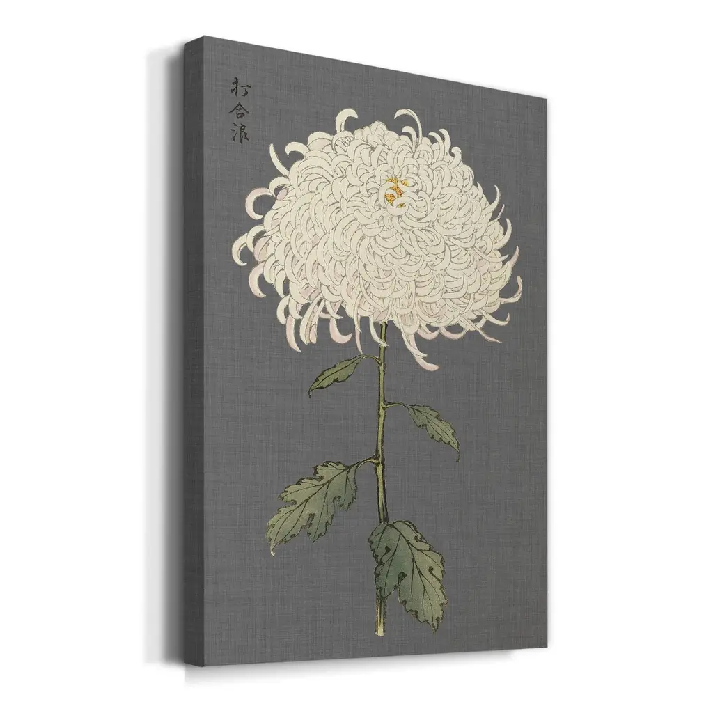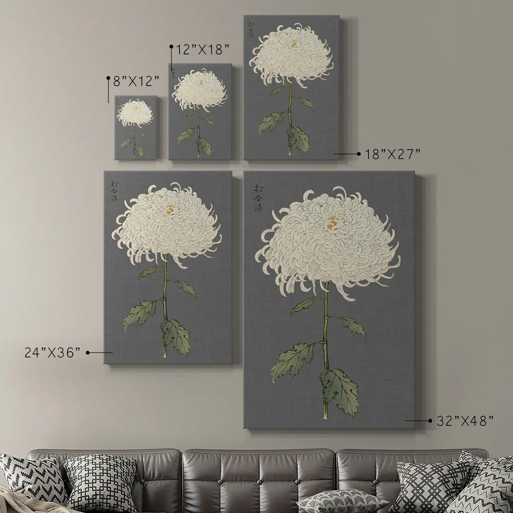 Dramatic Ivory Mums II Premium Gallery Wrapped Canvas - Ready to Hang A premium hand stretched gallery wrapped canvas print created to last. Featuring a beveled a solid wood stretcher bar, each piece comes ready to hand 6 SIZES AVAILABLE 8''X12'' - Overall Size 12''X18'' - Overall Size 18''X27'' - Overall Size 24''x36'' - Overall Size 32''x48'' - Overall Size 40''x60'' - Overall Size Each piece is made to order. Built to Last Each piece comes ready to hang Solid wood stretcher Fade and Water resistant Made domestically