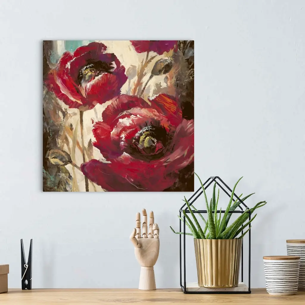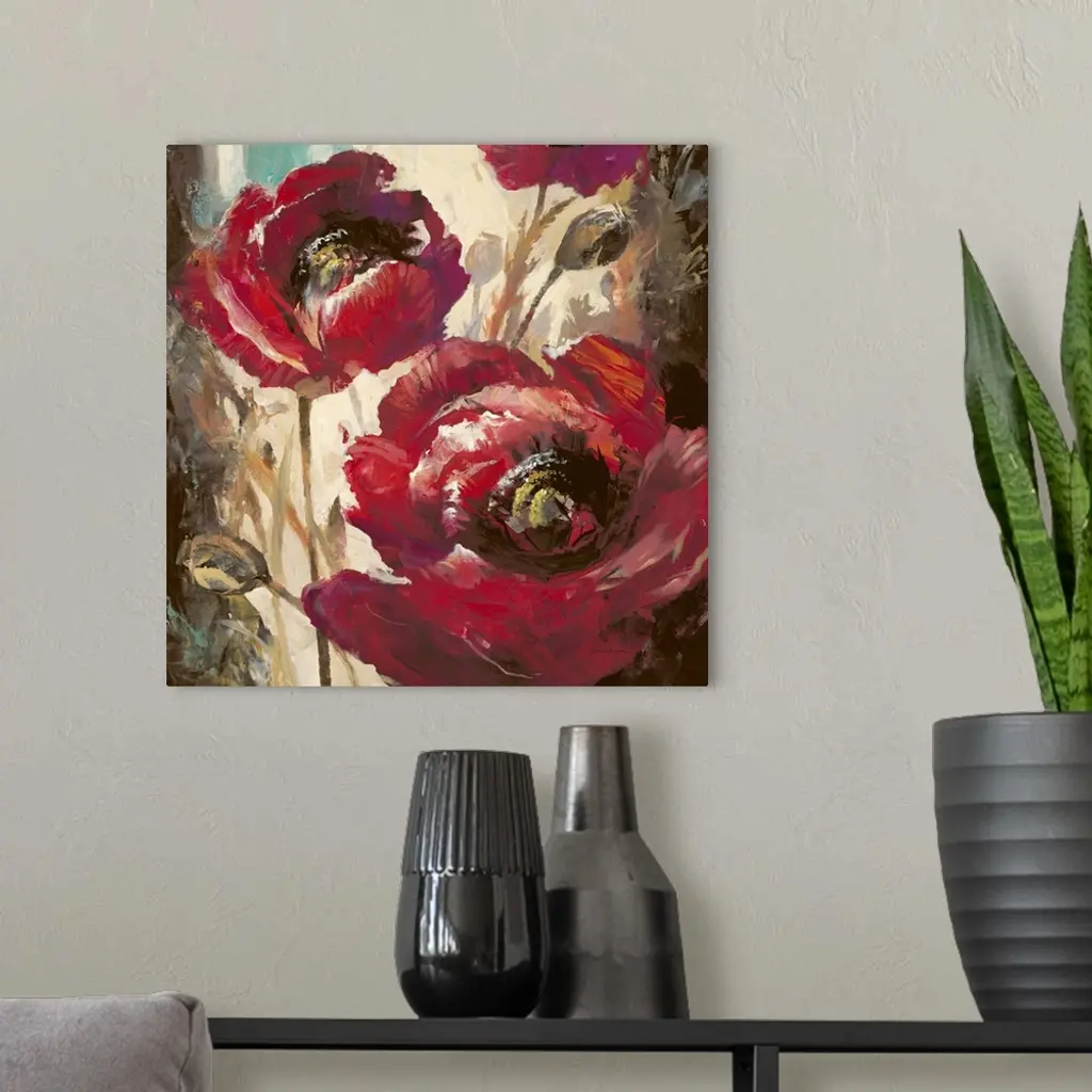 Contemporary painting of vibrant red poppy flowers.