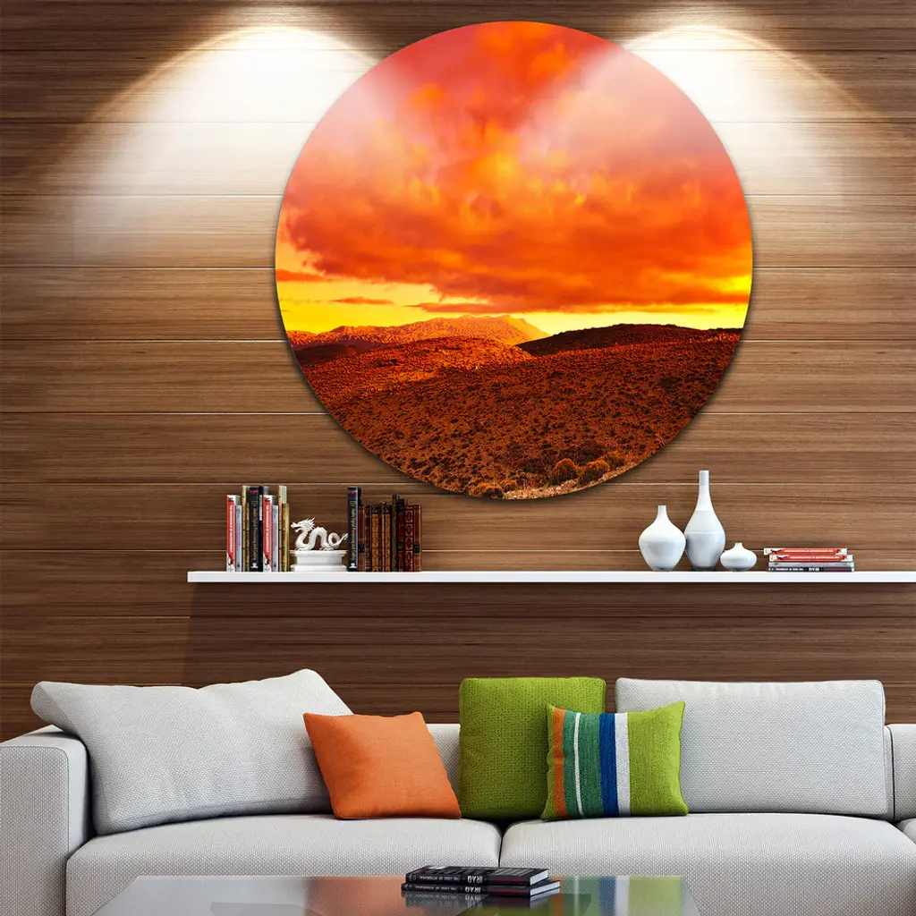 Dramatic Red Sunset At Desert, Large Disc Metal Wall Art Landscape, 11"