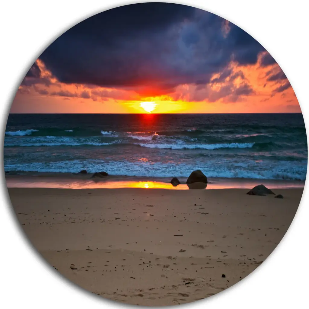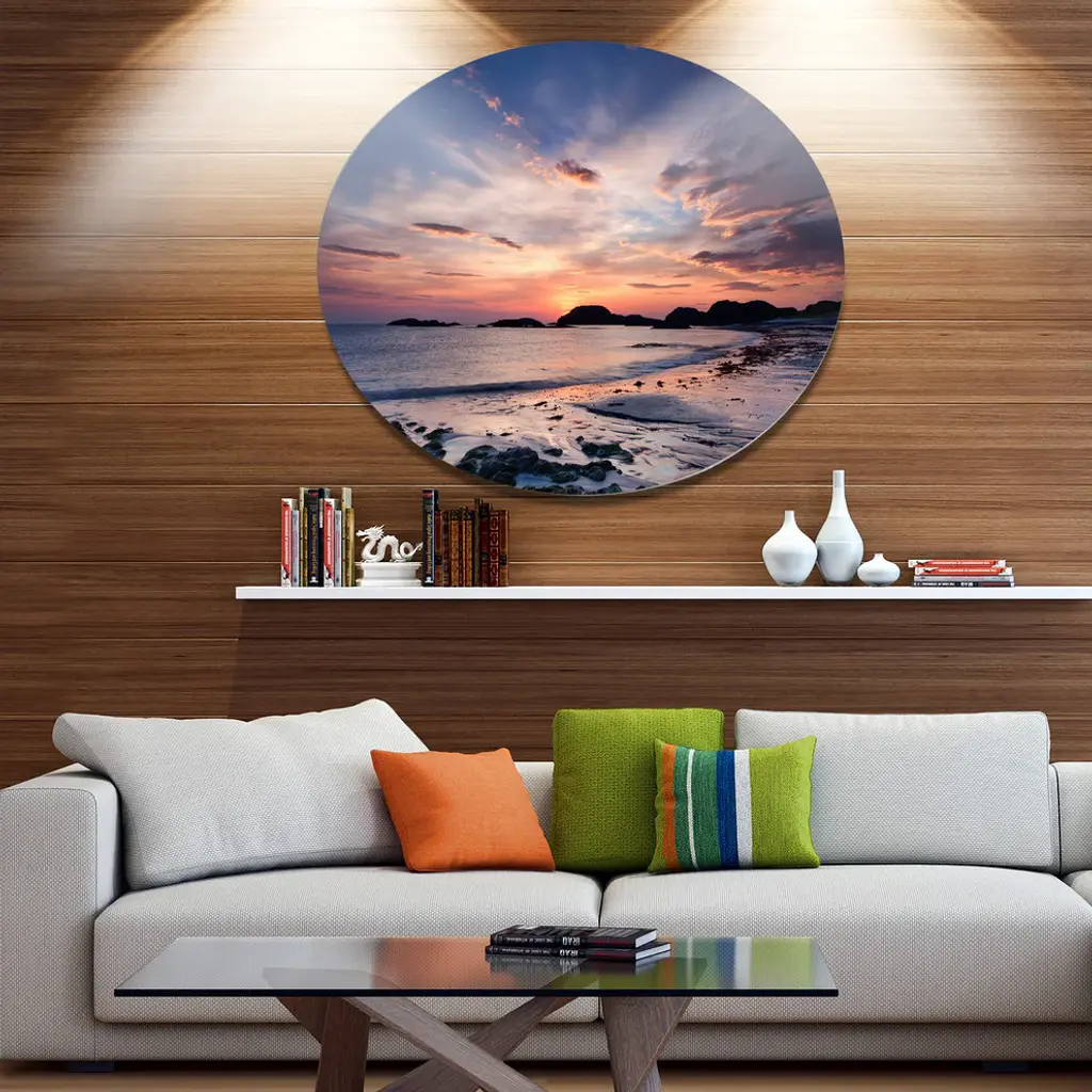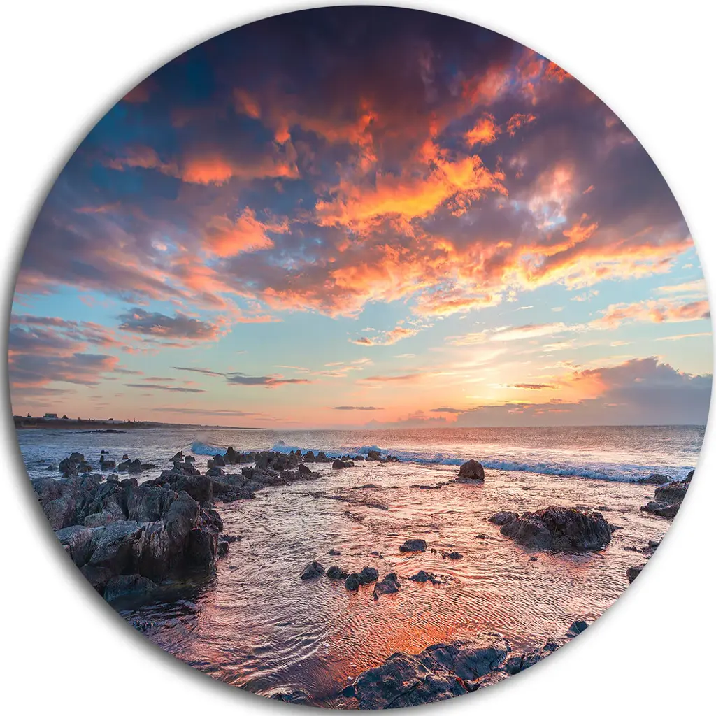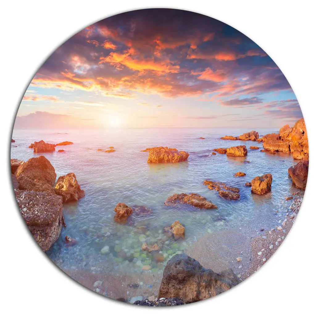 Bring Contemporary Abstraction to your home with this large Circle Metal wall art. This Dramatic Sky at Sunset on Isle of Iona Metal Artwork makes it the focal point of any room or office. - White Gloss Coating ensures colors are extra vibrant with light reflection.- Aluminum grade Sheet Metal with 1 inch mounting frame on the back giving the illusion that the artwork is floating on the wall..- Mounting Brackets are included along with instructions.- High Quality Digital images are created directly into a glossy aluminum panel producing a stunning and captivating print into the glossy finish of the metal.- Water, Fire and Scratch resistant HD Aluminum panels.- Looks better than any photo paper and guaranteed to last at least 20 years- Easy to clean with a microfiber cloth. Colors are far superior to regular Canvas Art. - Easy to Hang