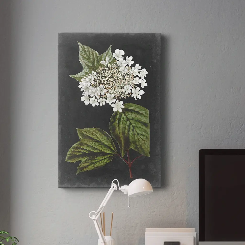 Dramatic White Flowers III Premium Gallery Wrapped Canvas - Ready to Hang A premium hand stretched gallery wrapped canvas print created to last. Featuring a beveled a solid wood stretcher bar, each piece comes ready to hand 5 SIZES AVAILABLE 8''X12'' - Overall Size 16'X20'' - Overall Size 24''x32'' - Overall Size 30''x40'' - Overall Size 36''x48'' - Overall Size Each piece is made to order. Built to Last Each piece comes ready to hang Solid wood stretcher Fade and Water resistant Made domestically