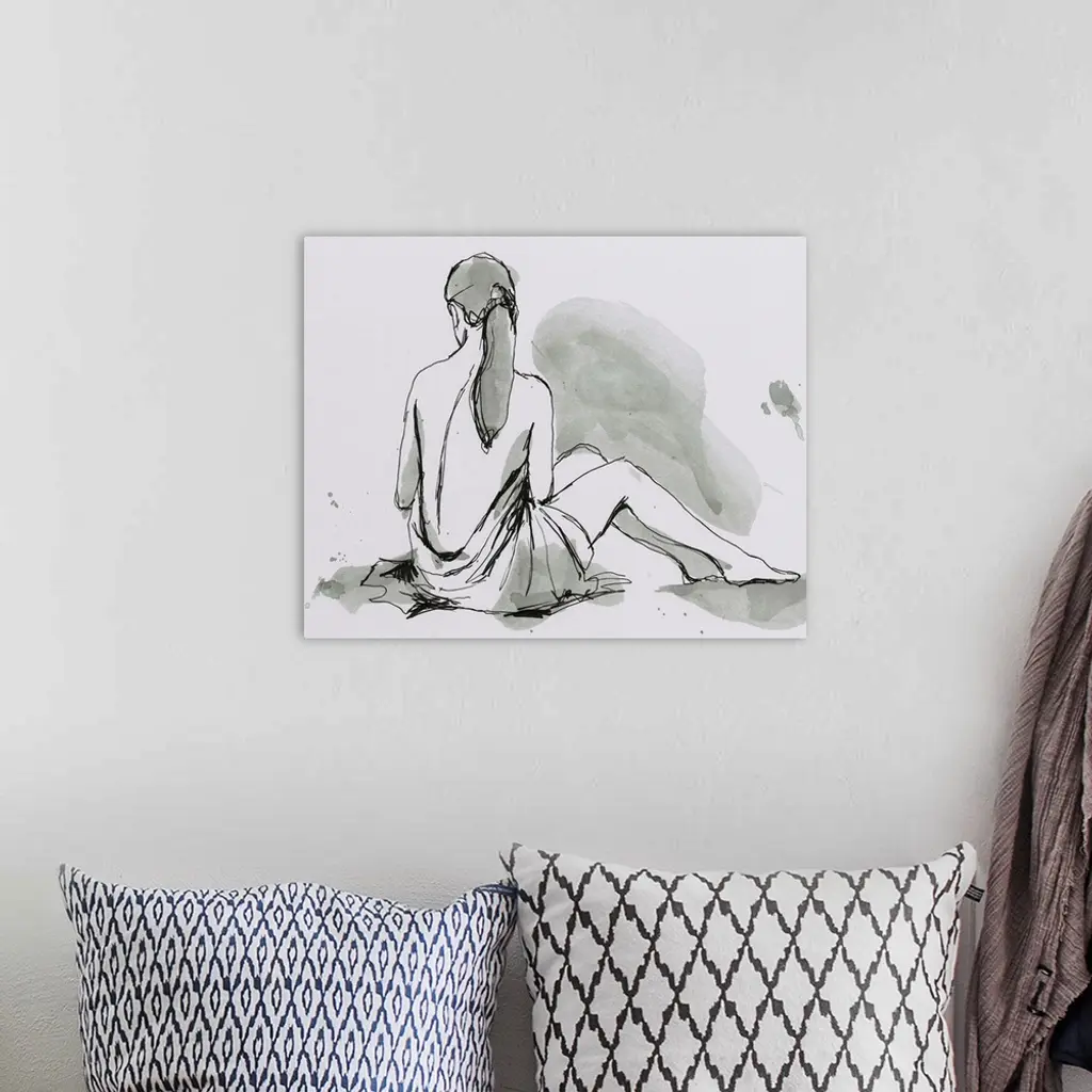 Contemporary figurative artwork of a seated nude female draped in a sheet.