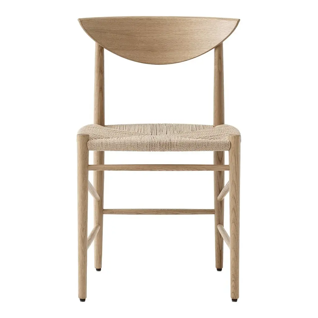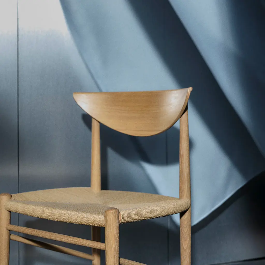 Drawn's understated design looks humble, but it is imbued with warmth. By the time Hvidt and Mølgaard crafted Drawn, also known as Model 316 - in 1956, the duo enjoyed fifteen years of furniture-making experience to draw from. No wonder they produced a chair that stands out as a definitive piece of Danish design. Relying upon the traditional craftsmanship techniques that Hvidt and Mølgaard learned at the School of Arts and Crafts in Copenhagen, Drawn brings a sense of wholesome honesty to any space. As its name suggests, the chair was sketched out by the duo in a pre-computer era. Such a hand-drawn approach is reflected in the clean simplicity of this charmingly unpretentious piece. Despite its classical origins, Drawn is a piece that is intended to be useful. Melding the beauty of historic Danish furniture-making with a decidedly modern sensibility, the hand-crafted chair boasts a solid oak or walnut form together with a hand-woven paper cord seat. While its lightweight frame might suggest otherwise, Drawn is a strong and stable construction that is underscored by a deep understanding of comfort. "Hvidt and Mølgaard crafted pieces that hold enduring appeal," says &Tradition CEO and founder Martin Kornbek Hansen. "Their rigorous approach to design is reflected in Drawn's strong, simple lines and use of organic materials." The chair's back, smooth and crescent shaped– is supported by two rounded columns that extend to the floor. An elegant symmetry is maintained with the identical front legs, which are connected to the back by two wooden spokes. Available in white oiled oak or oiled walnut, Drawn comes in two versions: a wider model with armrests HM4 , or one without armrests, HM3.