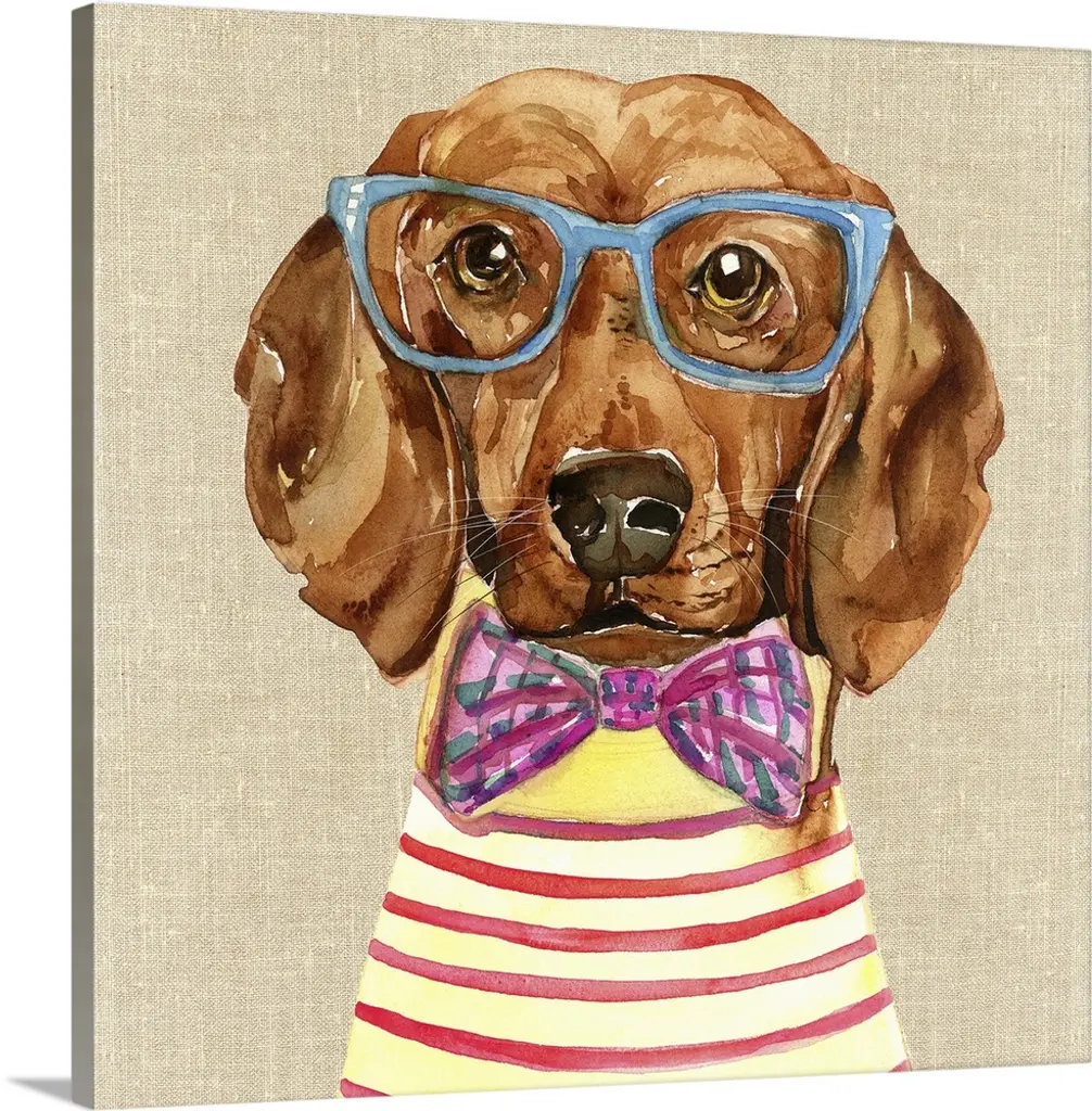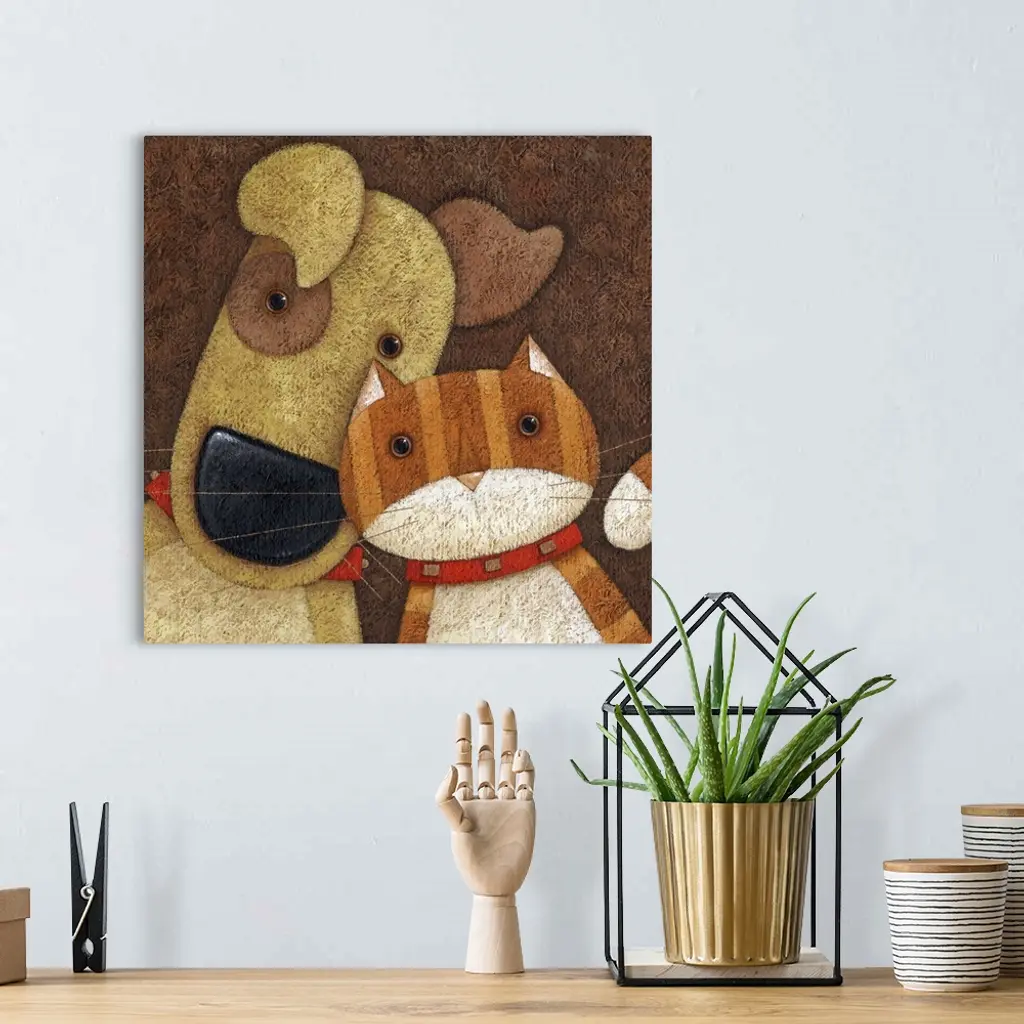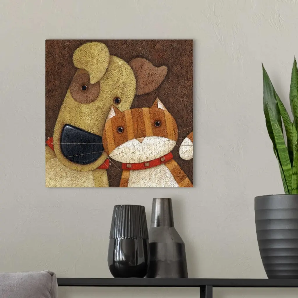 Contemporary painting of a dog with a spot over his eye next to an orange striped cat.
