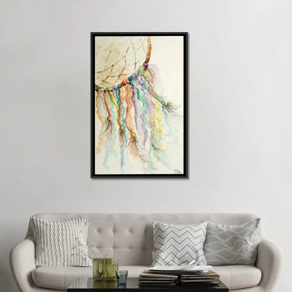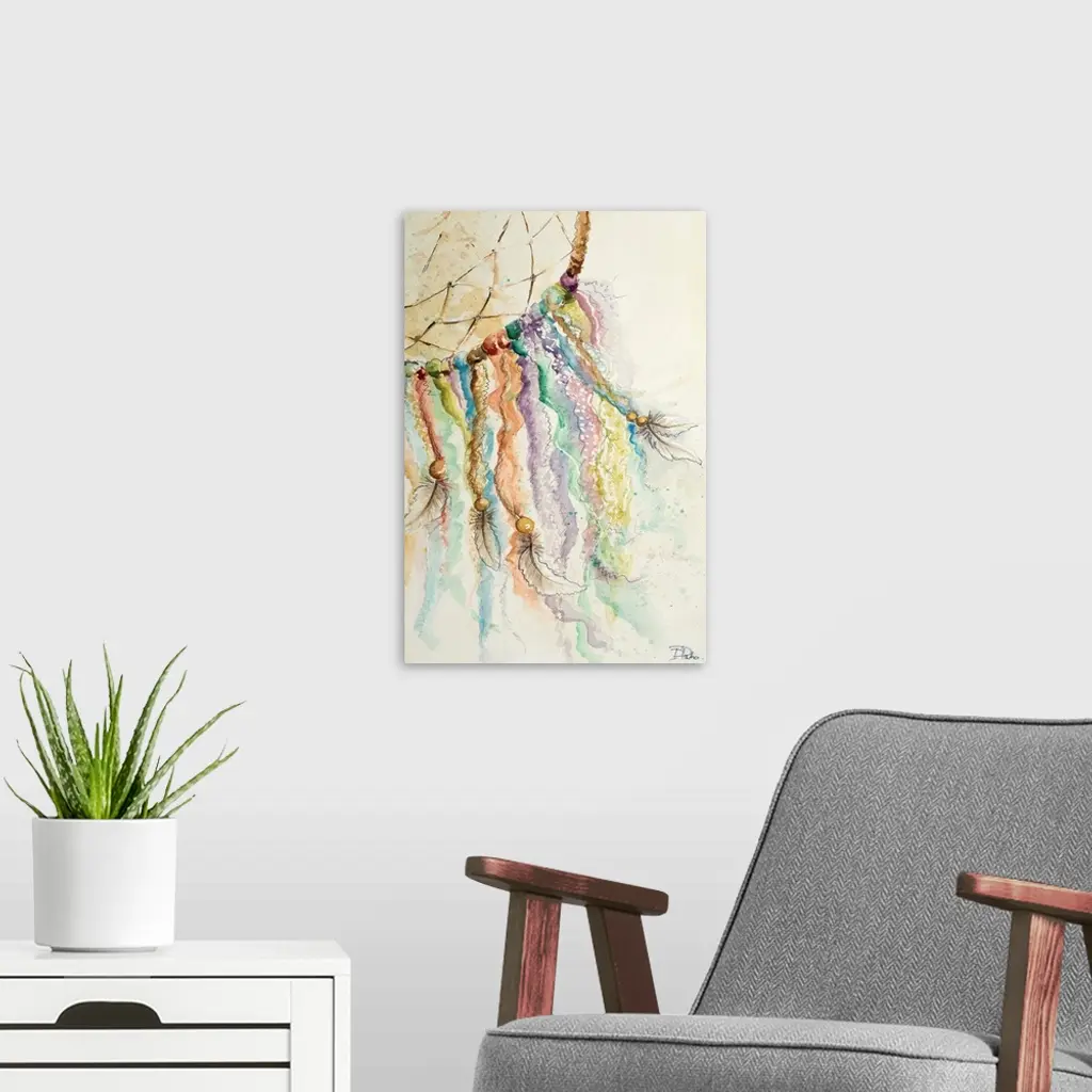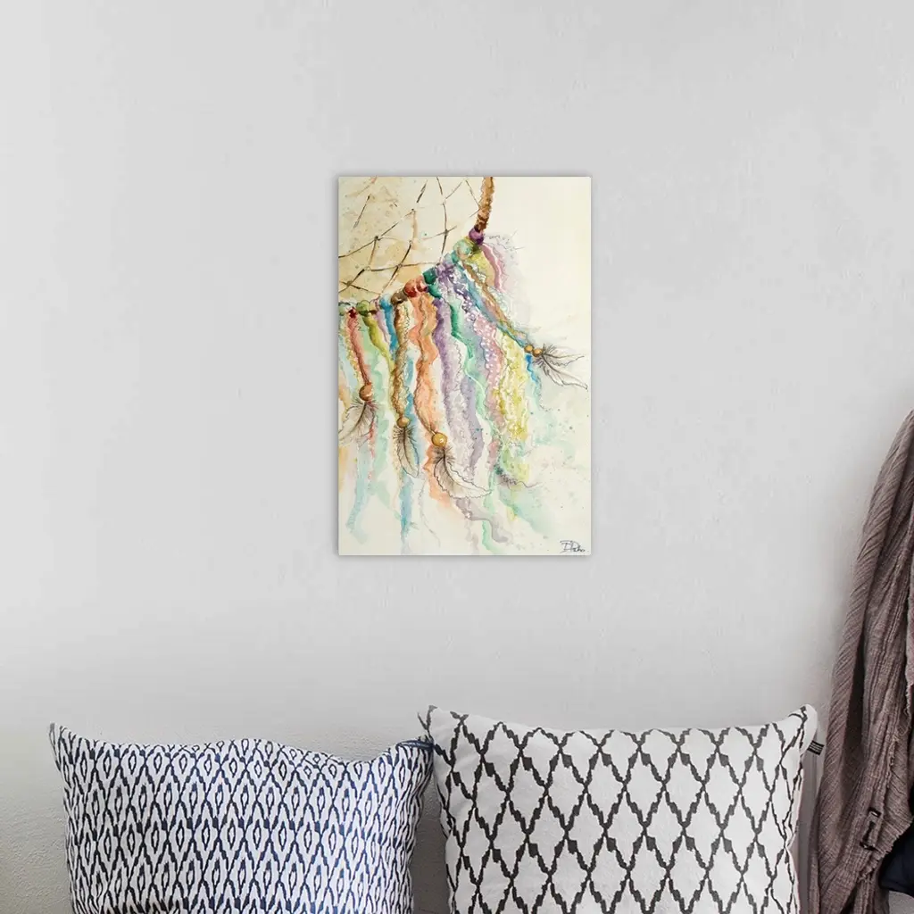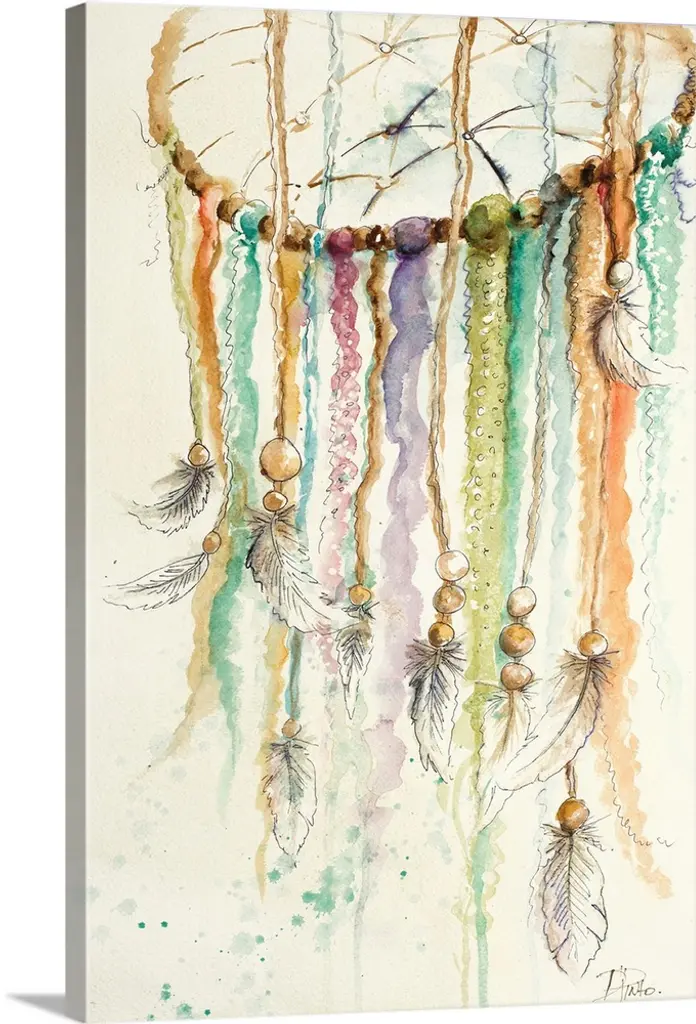 Painting of a dream catcher with cords of varying color and feathers tied to the ends.