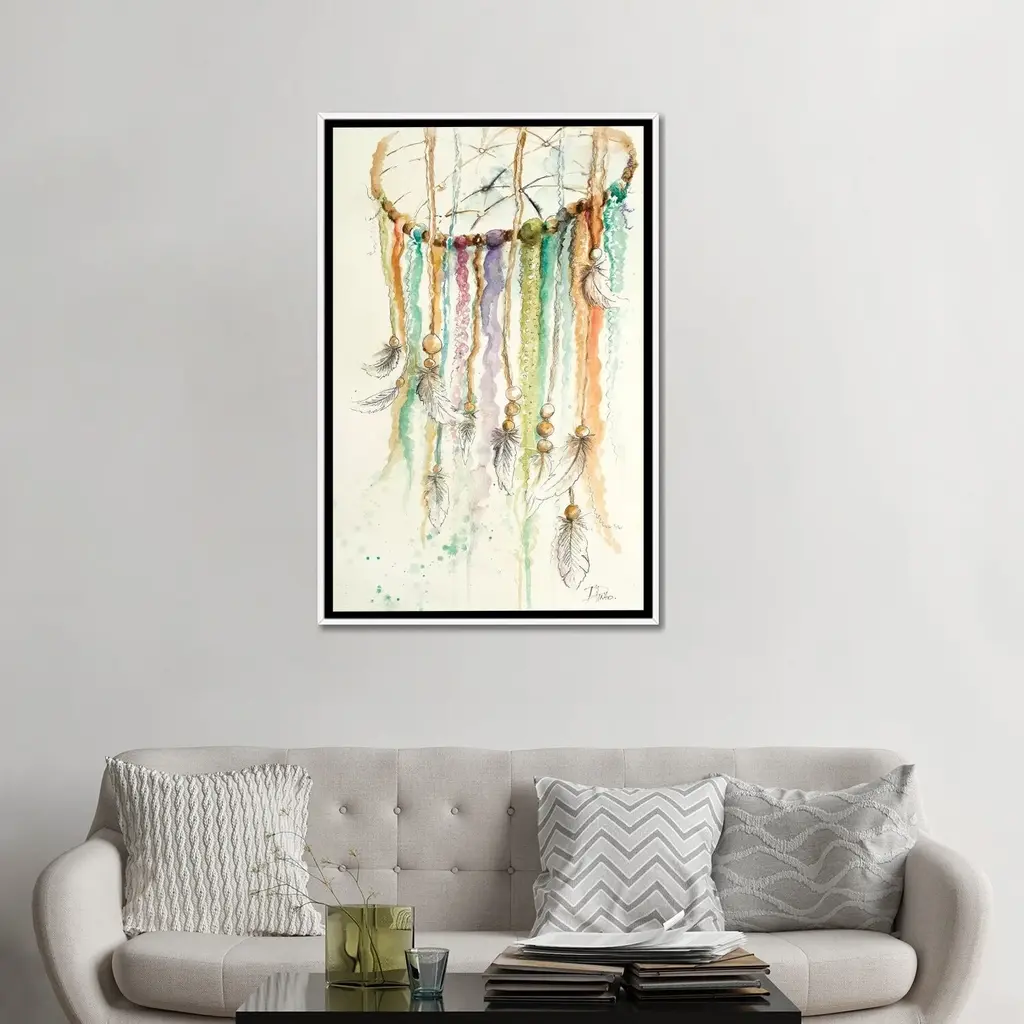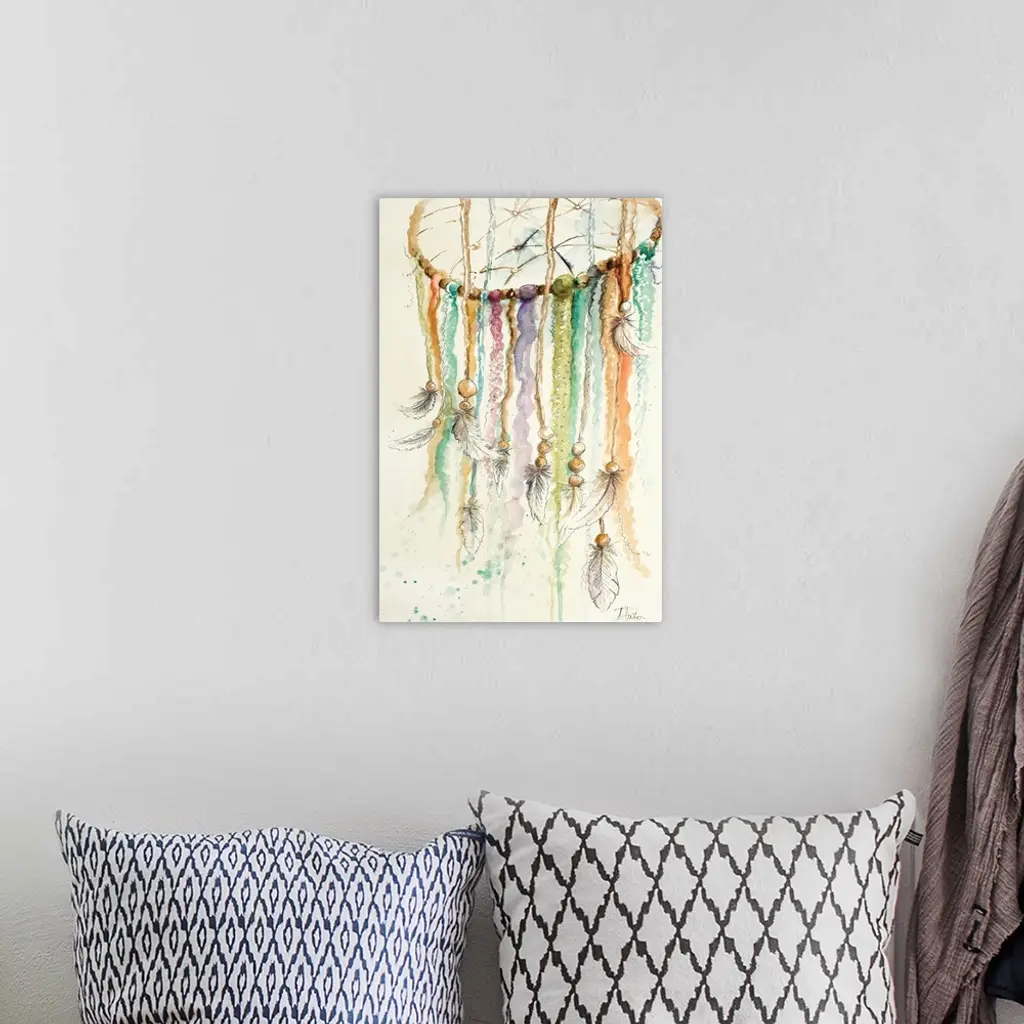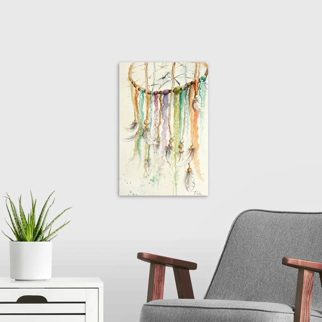 Painting of a dream catcher with cords of varying color and feathers tied to the ends.