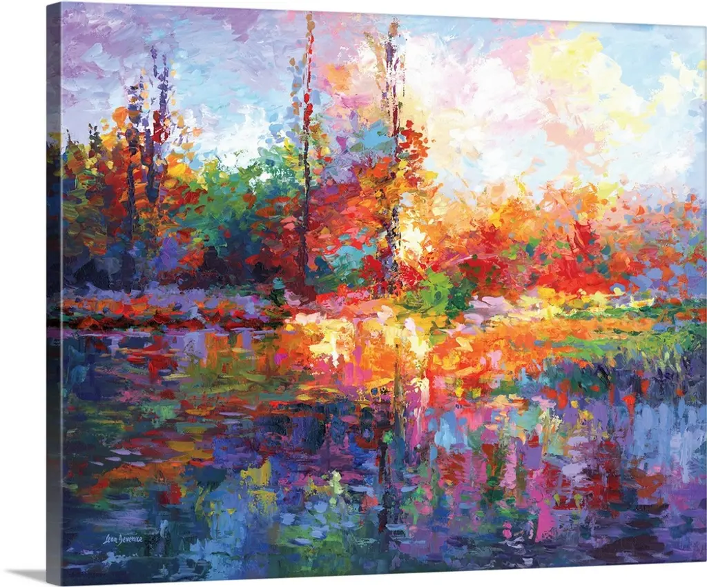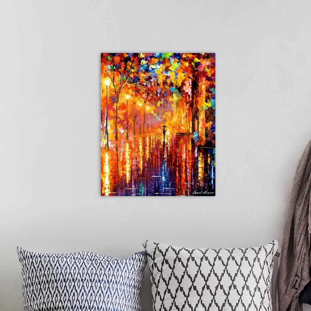 Contemporary colorful painting of a figure with an umbrella walking down a road in the rain.