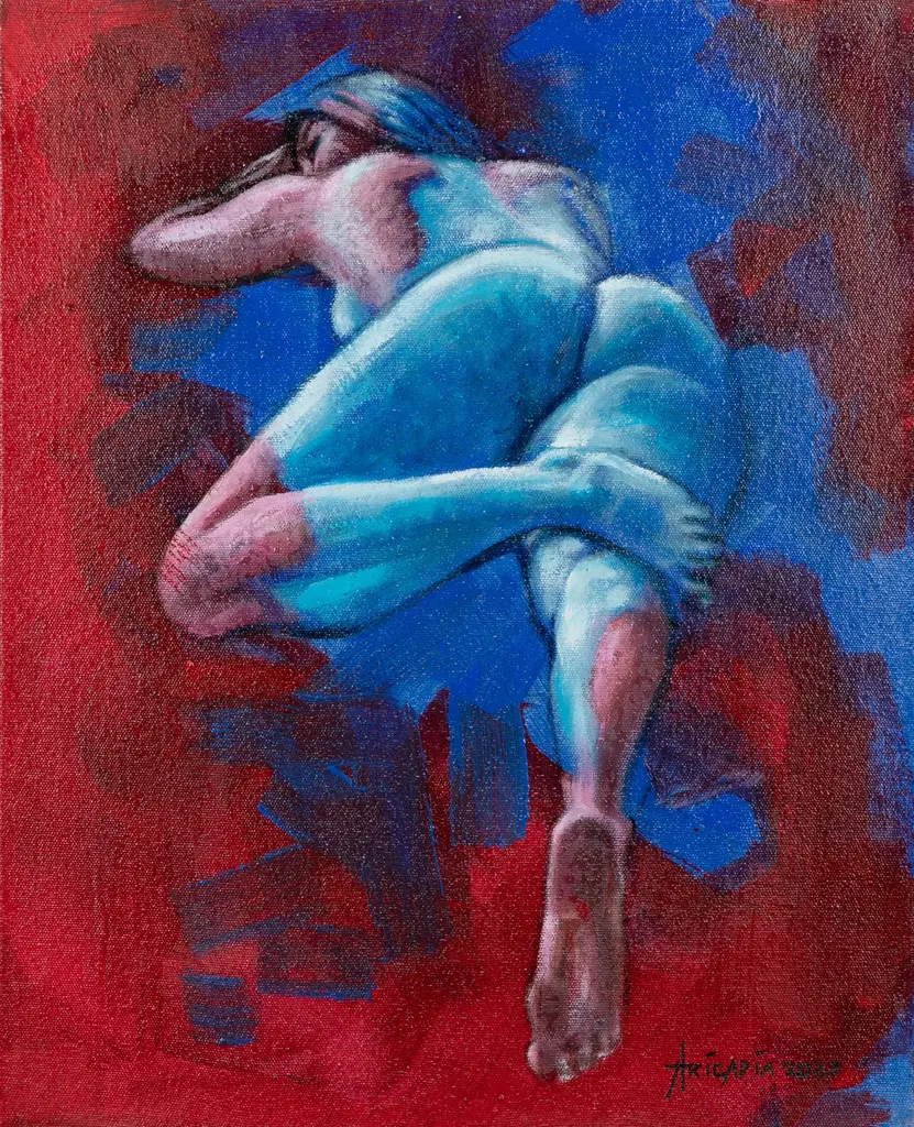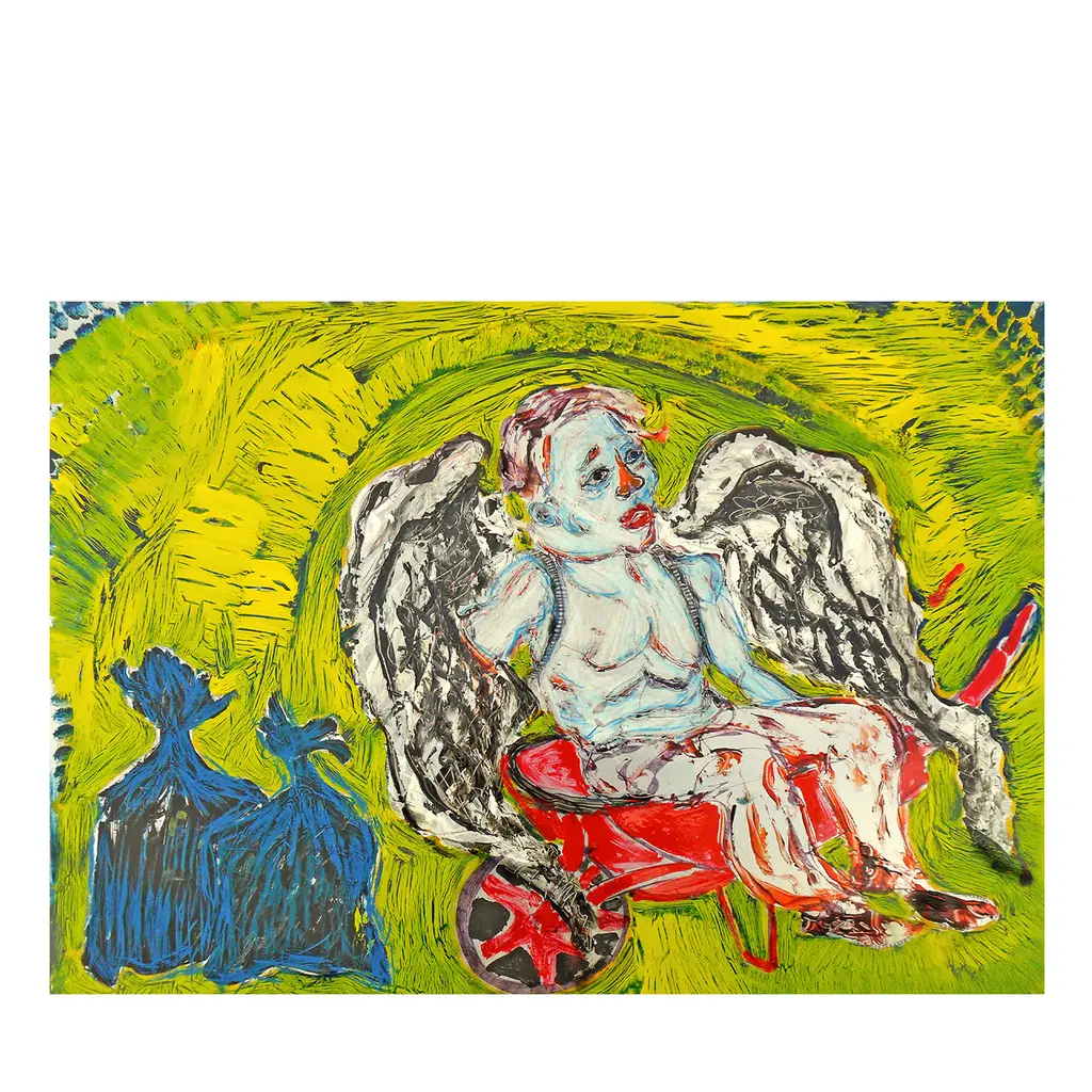 Secure brushstrokes distributed according to neat chromatic conflicts define this superb expressionist-style painting on golden paper. Part of a 2012 series about dreams, it depicts a weird blonde man holding a book whose cover states a provocative combination of the words "ass" and "legs". A pair of legs is depicted on the plate positioned right in front of the man, further stressing the piece's oneiric inspiration. Authenticity certificate included with purchase.