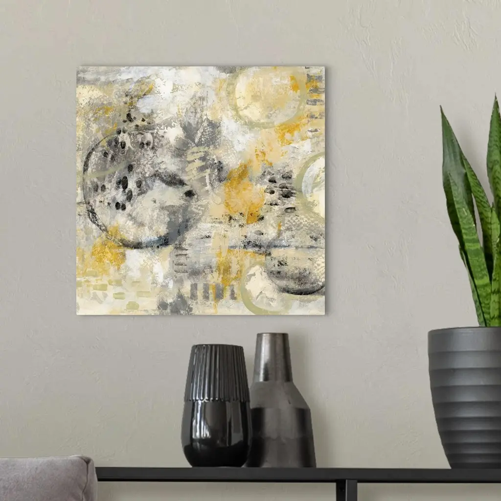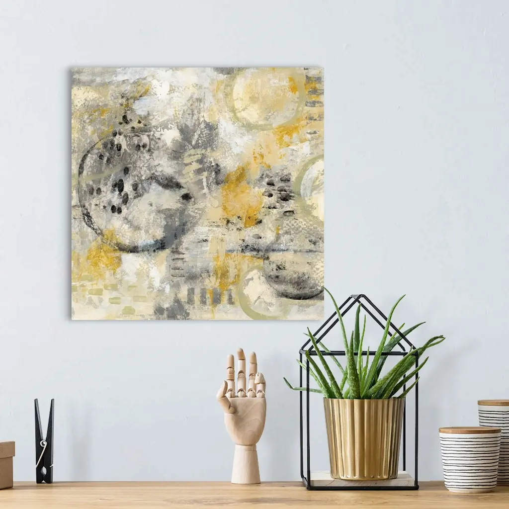 Square abstract painting using gold, black, and grey hues with hidden circles sporadically around.