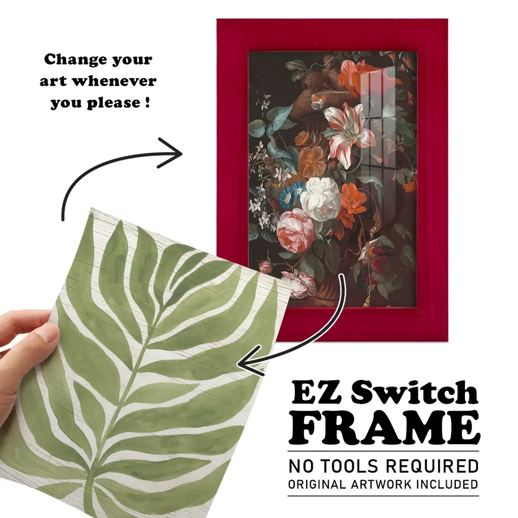 Driftwood Palm Leaf I -EZ SWITCH Framed Print w/glass-Cherry Red A delightful, framed print. Featuring a solid wood frame with real wood glass. This premium print is giclee quality. In addition, every frame features a removable back and table top stand. This allows you to change your art in the future or to just stand the art on a table for a new look. We are sure you'll enjoy our new series of EZ SWITCH Framed Art. Solid Wood Frame Real Glass Removable / Replaceable Art Built in Tabletop Stand Sizes range from 4x6 up to 12x15 - buy just one or pair them up as sets as you see fit.