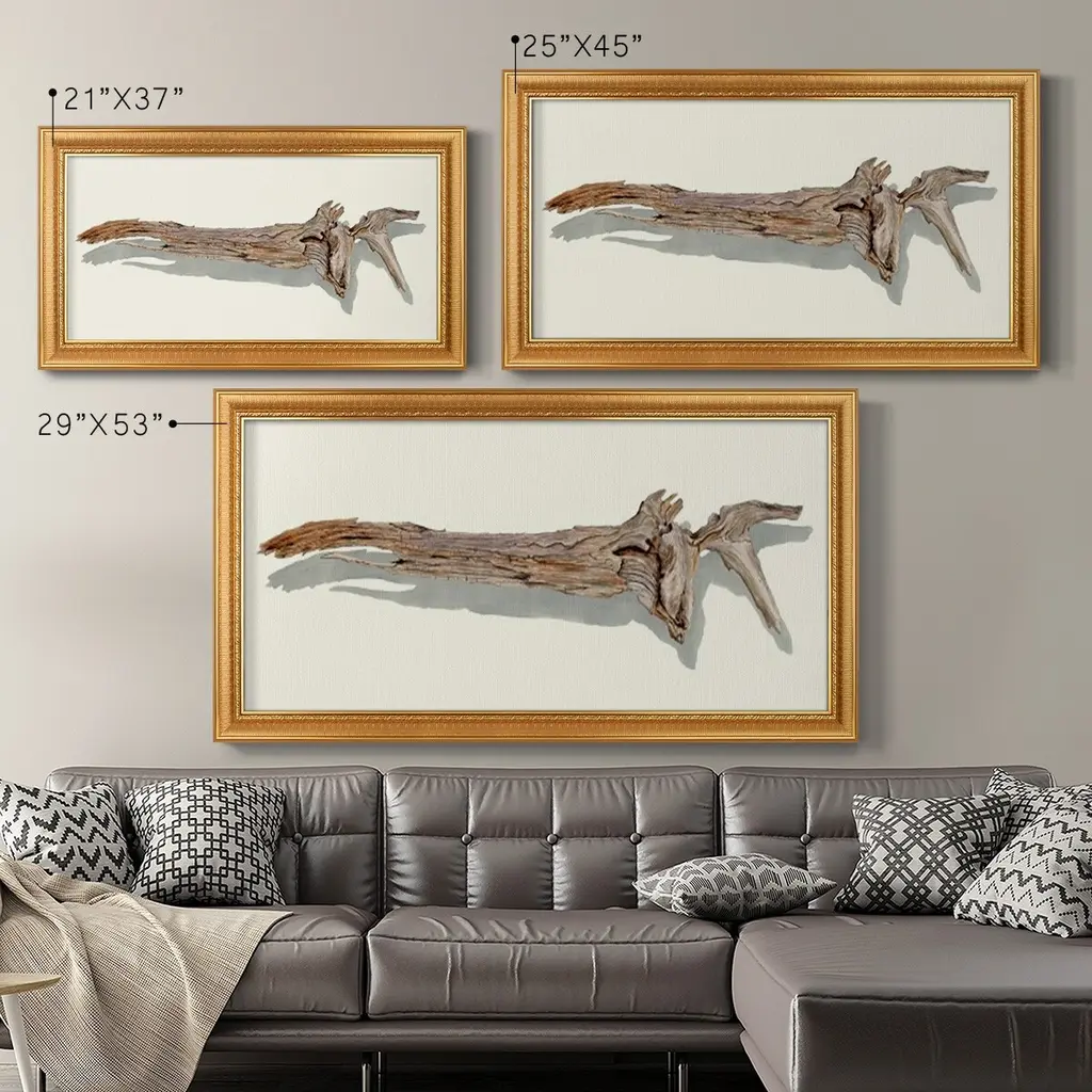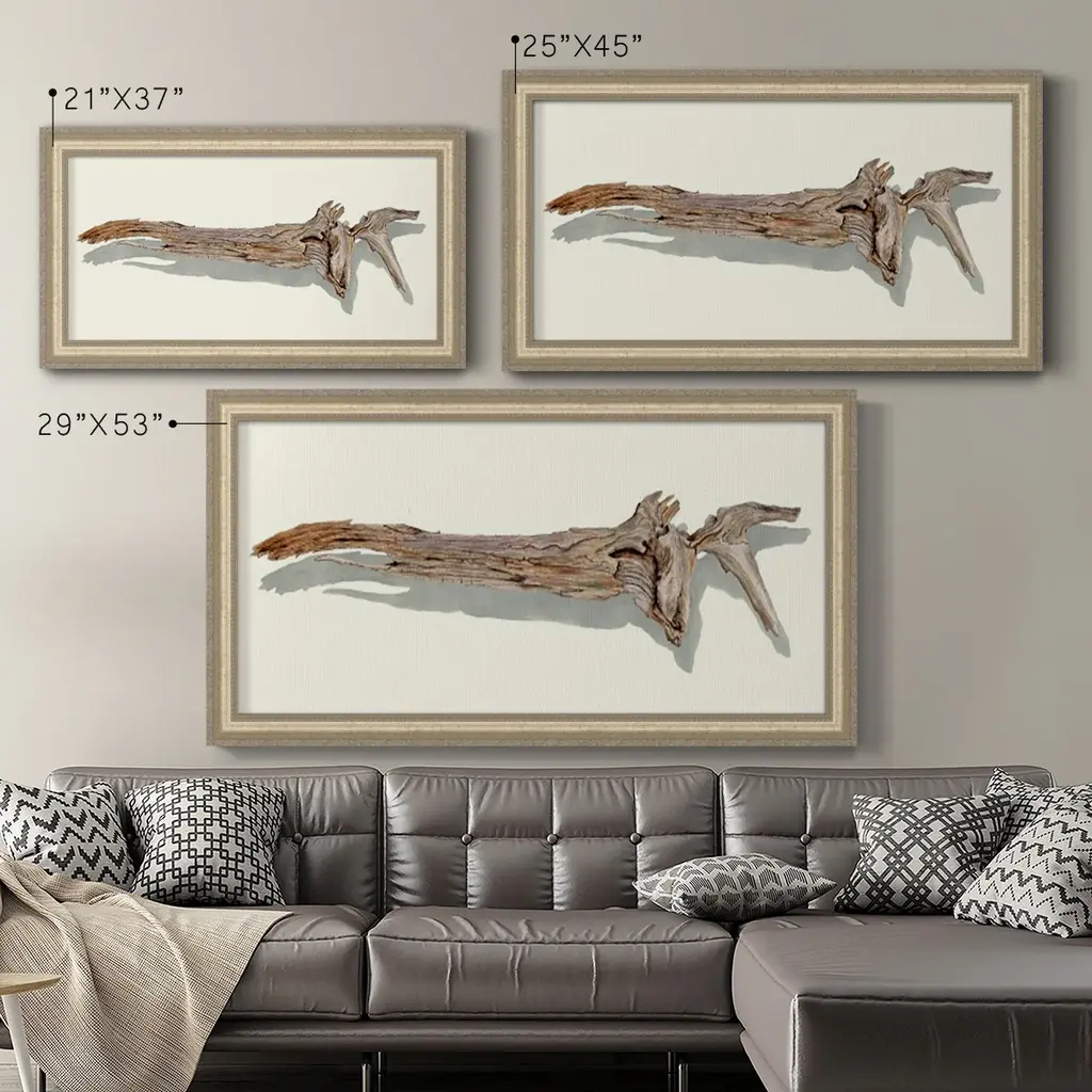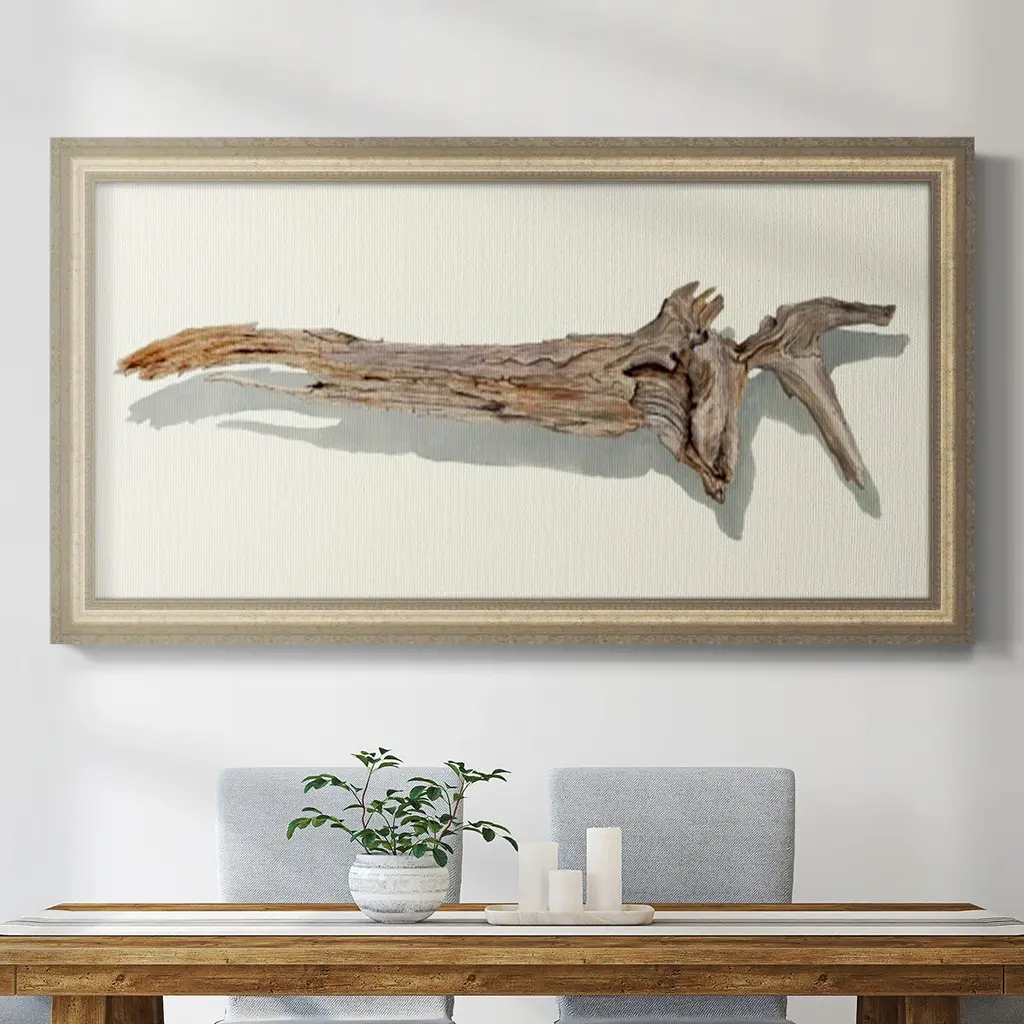 Driftwood Study II Premium Framed Canvas- Ready to Hang A Premium Framed Canvas created to last. Framed in distressed wood and available in an array of sizes and colors Featuring a beveled a solid wood stretcher bar, each piece comes ready to hand 3 SIZES AVAILABLE 21''X37'' - Overall Size 25''X45'' - Overall Size 29''x53'' - Overall Size Each piece is made to order. Each piece comes with hanging hardware. Made in the USA Ready to Hang Giclee Paper Print Acrylic Glass Beveled Matt Board