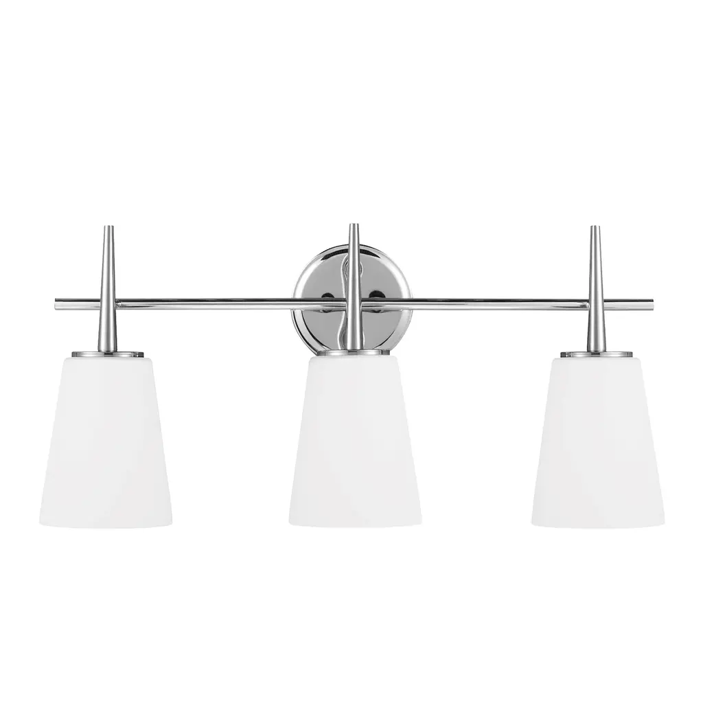 The Driscoll Vanity Light by Generation Lighting is an elegant 1960s style lighting solution. Constructed with Opal Etched glass shades supported by tapered Steel holders, a slim bar, and a rounded wallplate, this fixture can be mounted both up and down for a variety of lighting effects. The LED version is dimmable with an ELV dimmer, Energy Star rated, and provides a soft, even illumination. Features