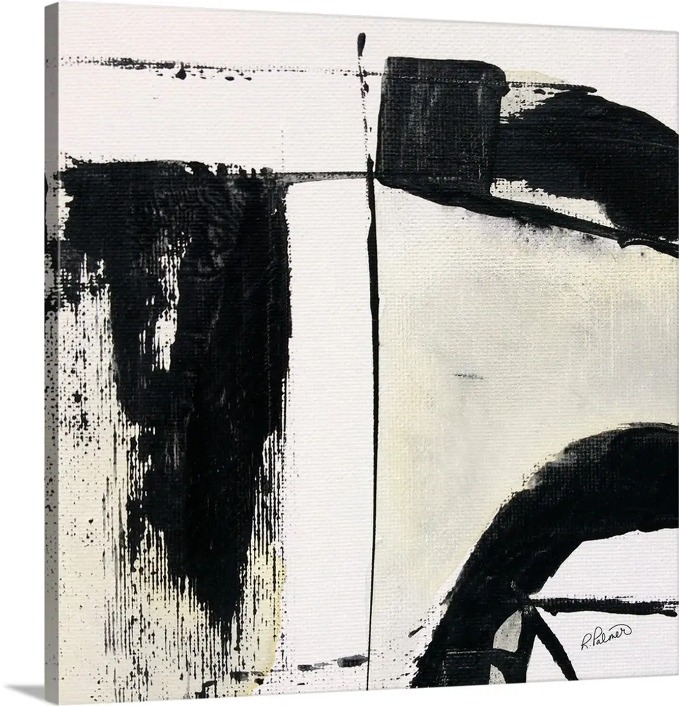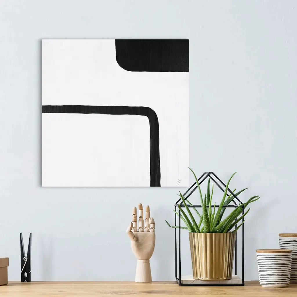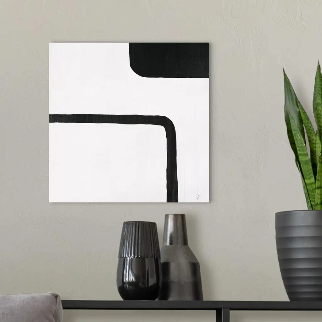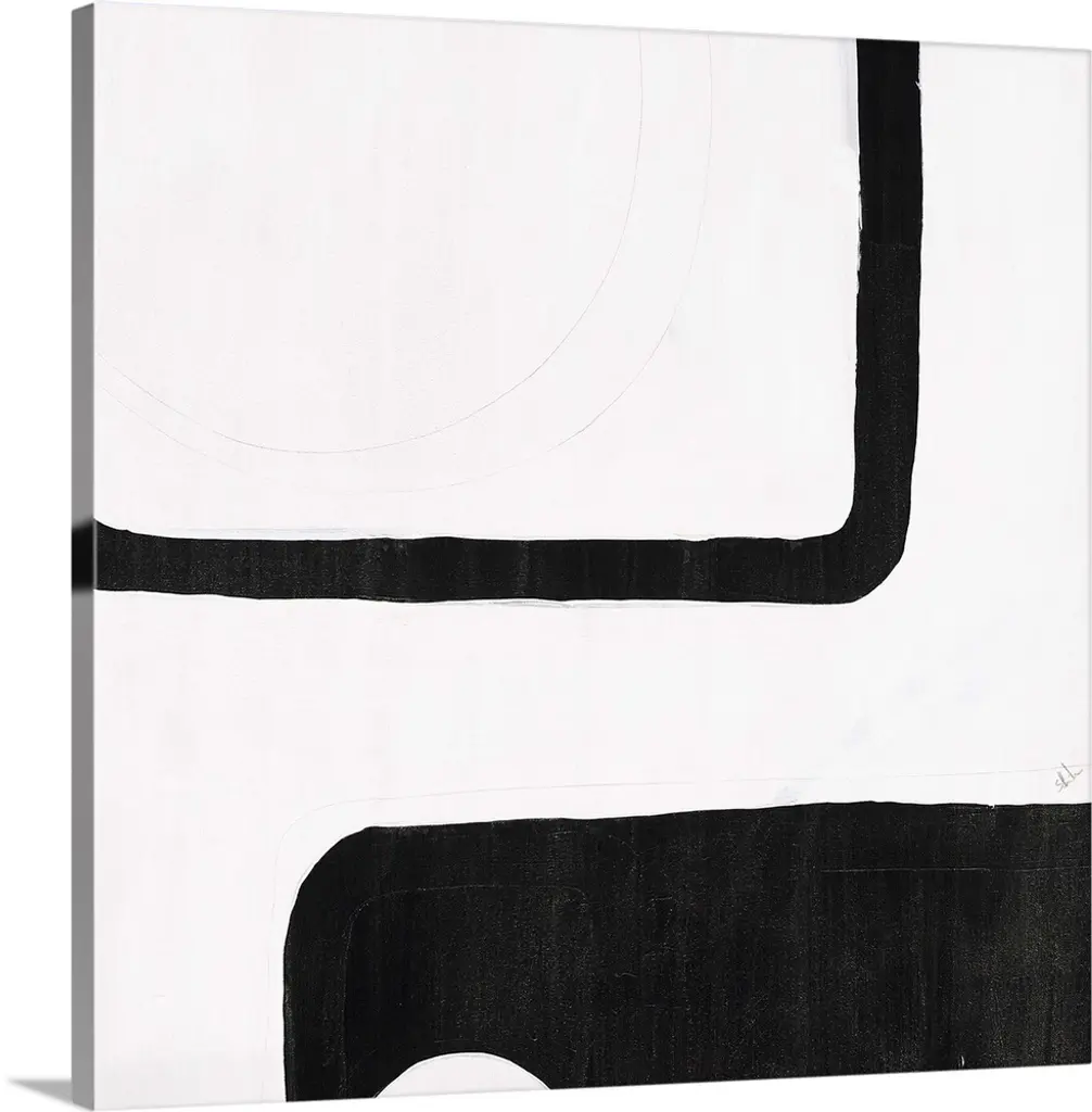 A black and white contemporary abstract painting with geometric shapes connecting together with lines.