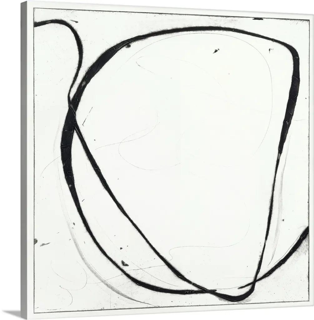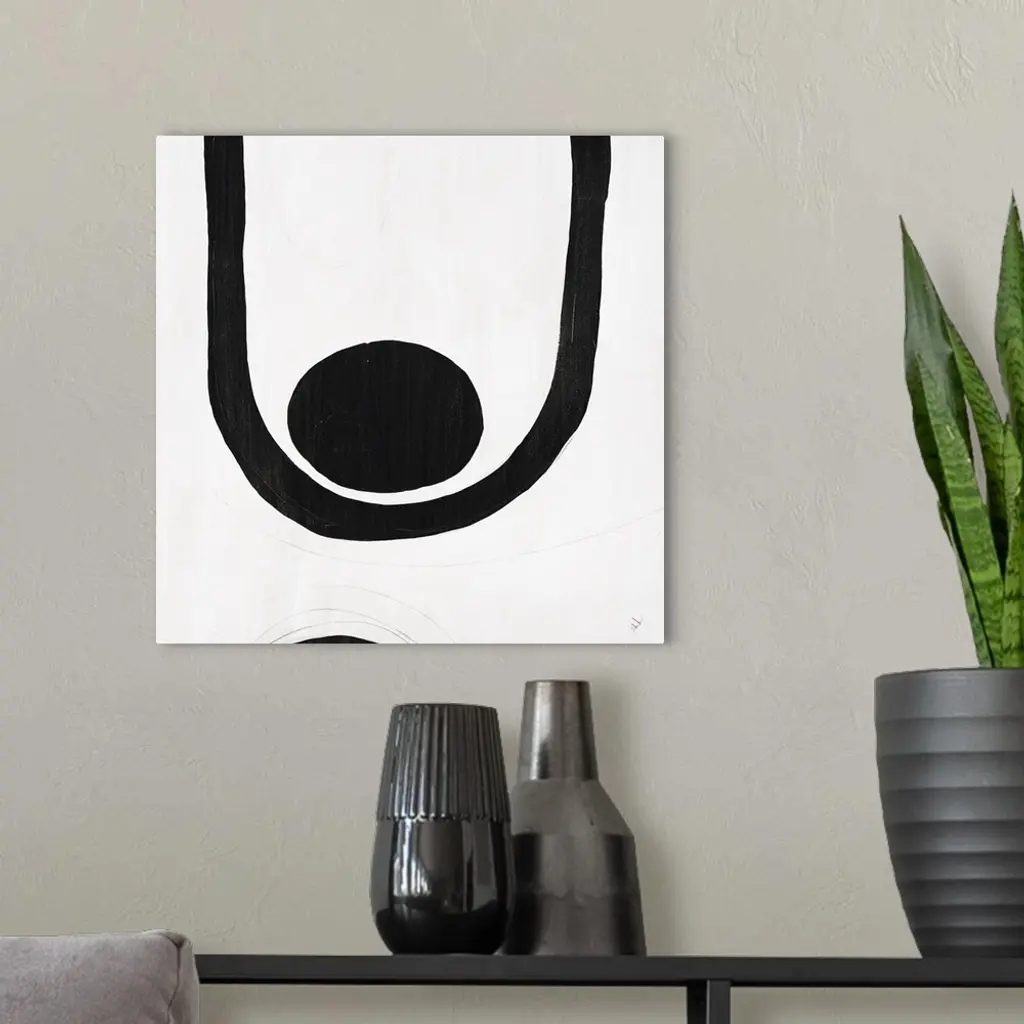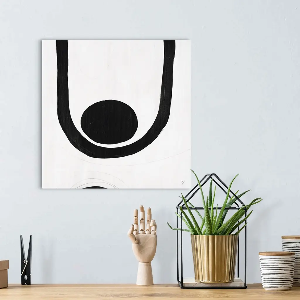 A black and white contemporary abstract painting with geometric shapes connecting together with lines.