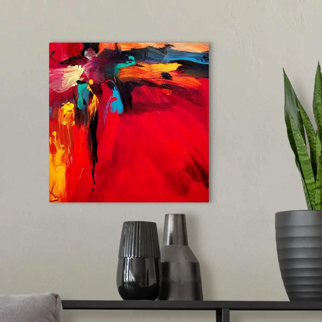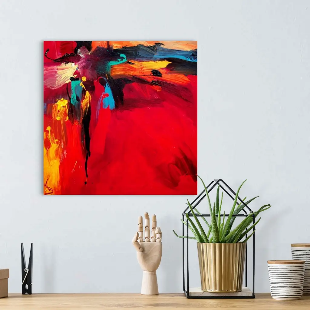 Exciting contemporary painting with wild, bold brushstrokes emanating from the top left corner and flowing out onto the deep red canvas.