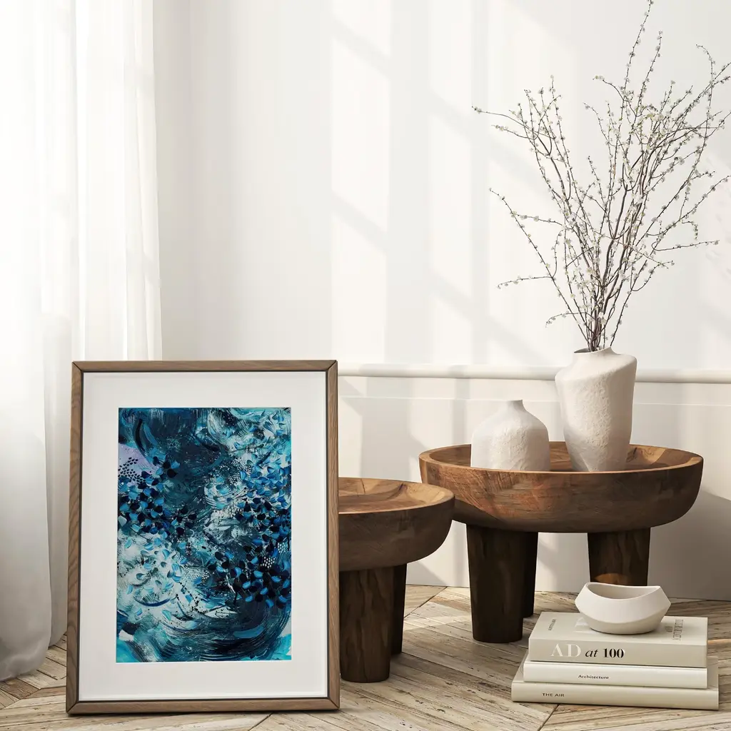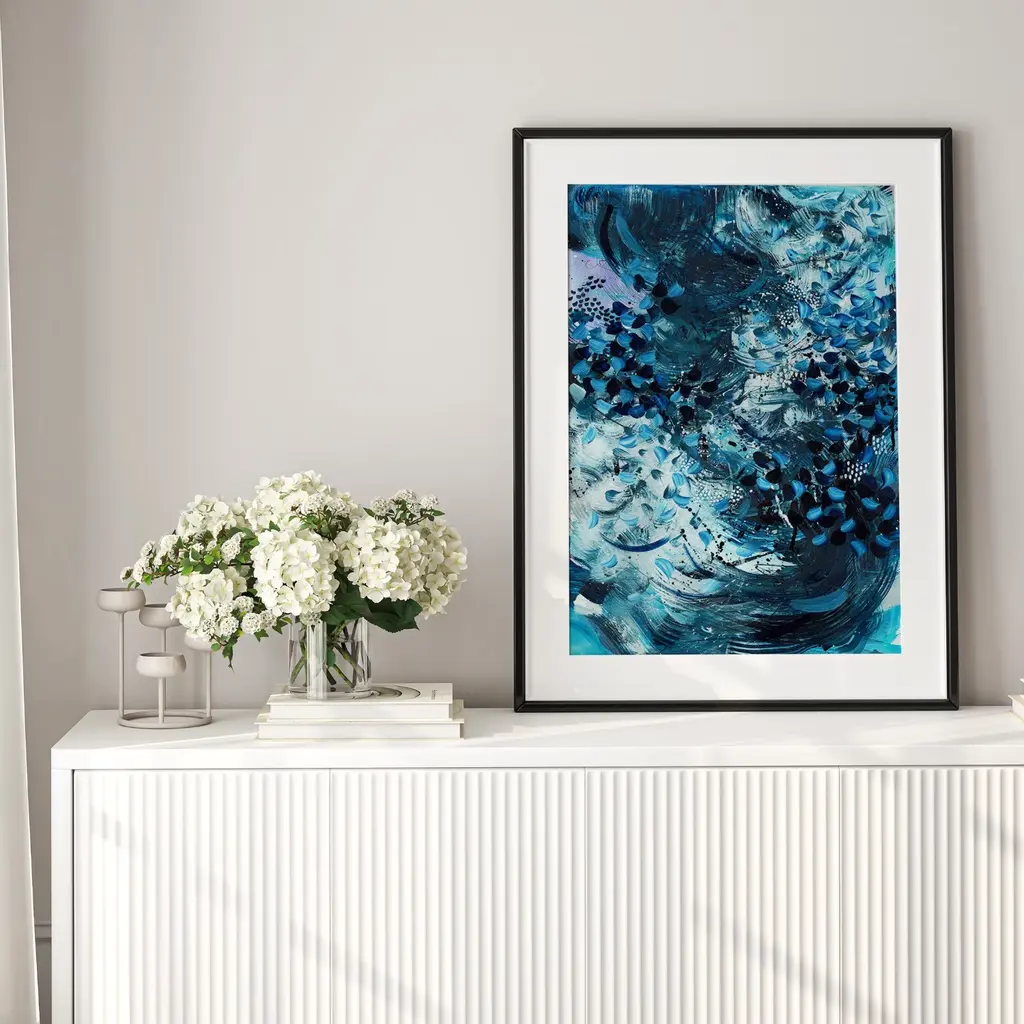 'Drowning In The Blue Nile; is a limited edition abstract print that celebrates Taylor Swift's The Tortured Poet's Department album with a focus on its abundant ocean references. Lyrics such as 'building up like waves, crashing over my grave' and 'the ocean rocks, crashing into him tonight' deeply influenced this piece, capturing the liberating dance of ocean waves crashing.This artwork translates the album's themes of emotional depth and poetic imagery into vibrant oceanic hues and dynamic brushstrokes.Printed on heavyweight 316gsm cotton rag textured paper using archival-quality inks, this limited edition A4 giclée print will maintain its beautiful vibrancy for many years to come. Each print has a white border so it can easily fit into a standard size frame. Print is sold unframed.