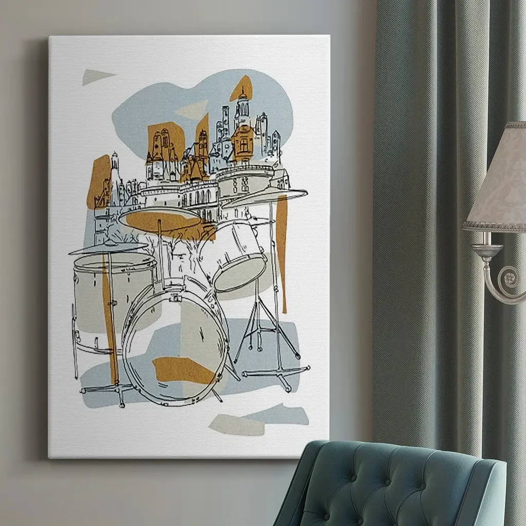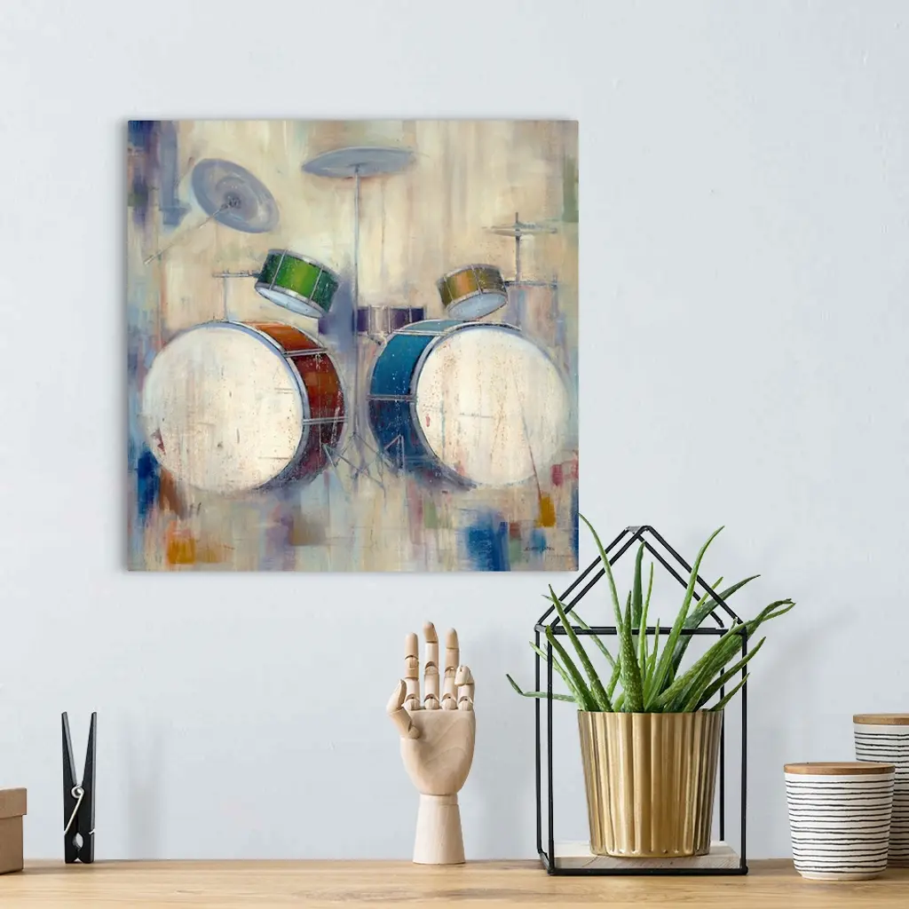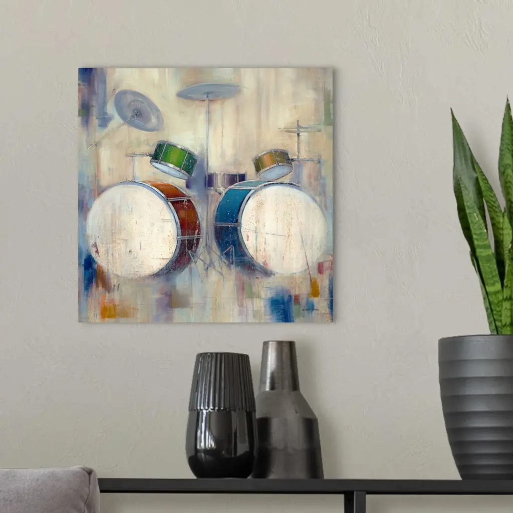Square oversized artwork of a colorful drum set with symbols, the edges fading into a patchy, heavily brush stroked background with pops of vibrant color.