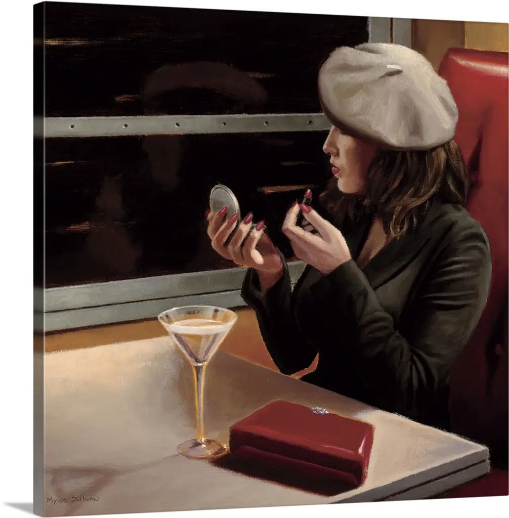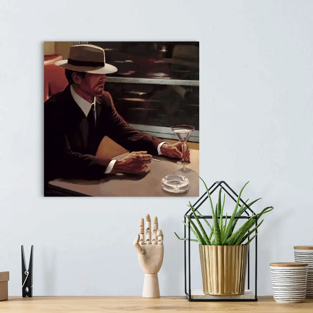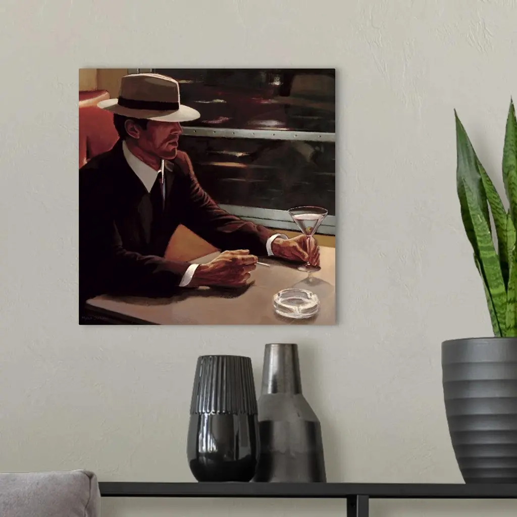 Contemporary artwork of a man as he sits in a booth drinking a martini and smoking a cigarette.