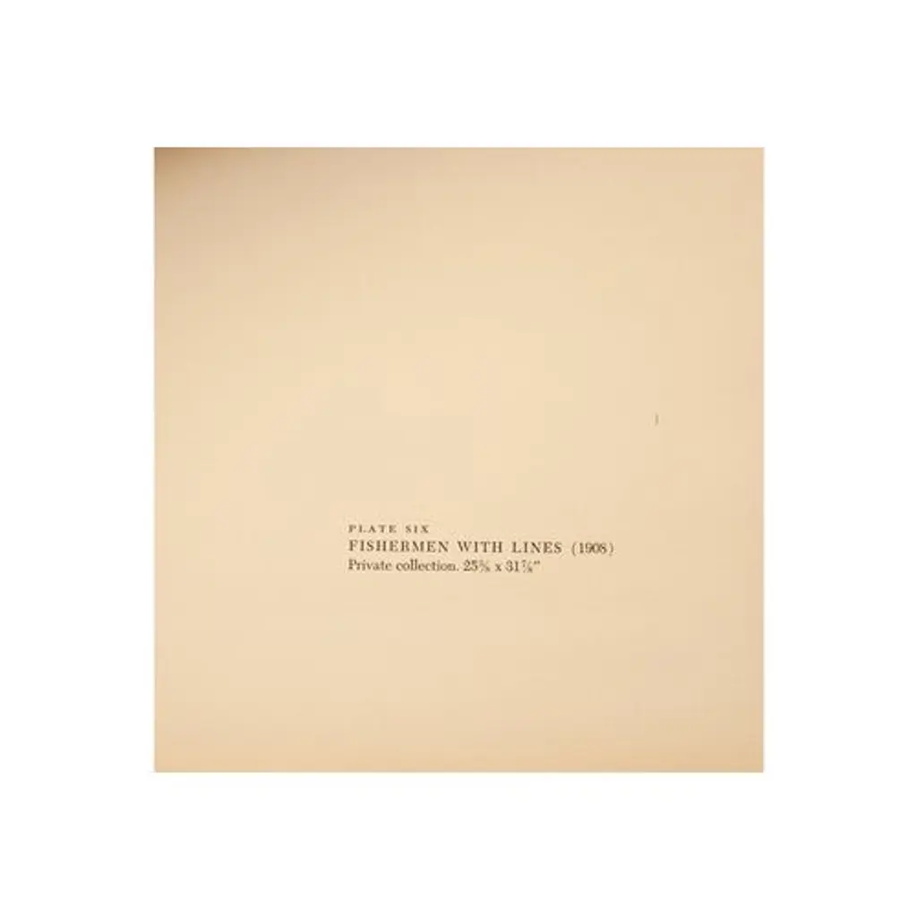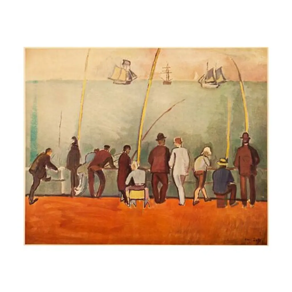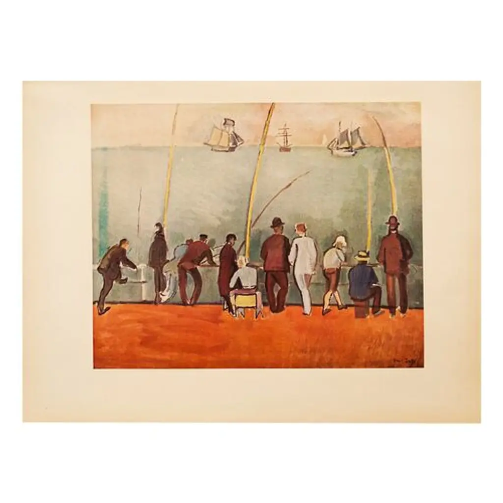 Vintage original tipped-in offset lithograph print after painting "Fishermen with Lines" by Raoul Dufy (1877-1953). Comes from a rare folio published in 1953 or 1954. First American Edition. Signed in the print. Hand tipped-in on a sheet of heavy paper. Information regarding the original artwork will be found by lifting the piece. Printed on one side. Excellent condition - never framed. Image: 10.5"L x 8.45"H.