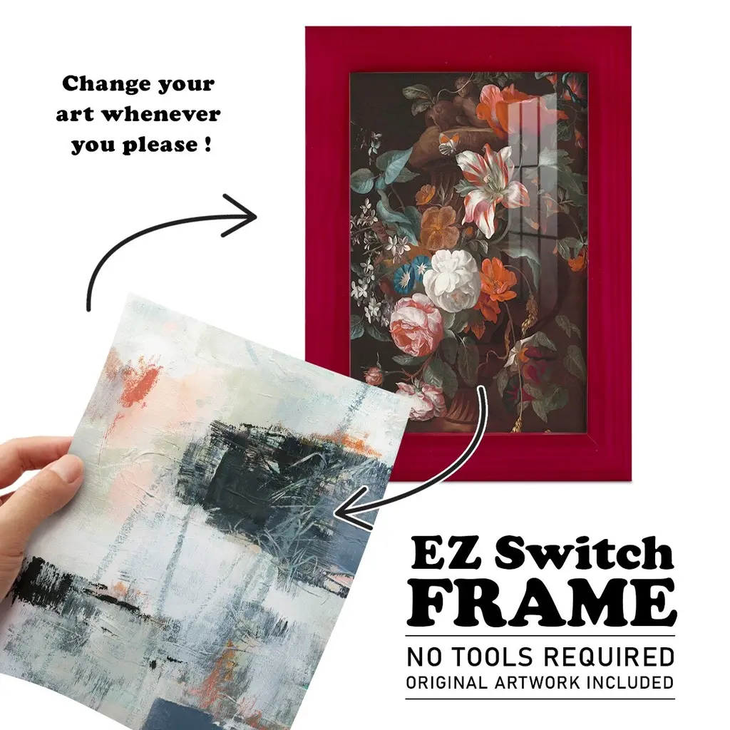 Dunbar I -EZ SWITCH Framed Print w/glass-Cherry Red A delightful, framed print. Featuring a solid wood frame with real wood glass. This premium print is giclee quality. In addition, every frame features a removable back and table top stand. This allows you to change your art in the future or to just stand the art on a table for a new look. We are sure you'll enjoy our new series of EZ SWITCH Framed Art. Solid Wood Frame Real Glass Removable / Replaceable Art Built in Tabletop Stand Sizes range from 4x6 up to 12x15 - buy just one or pair them up as sets as you see fit.