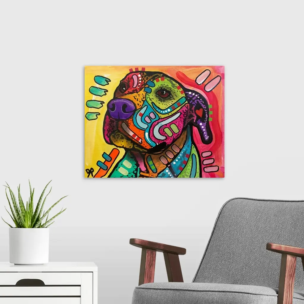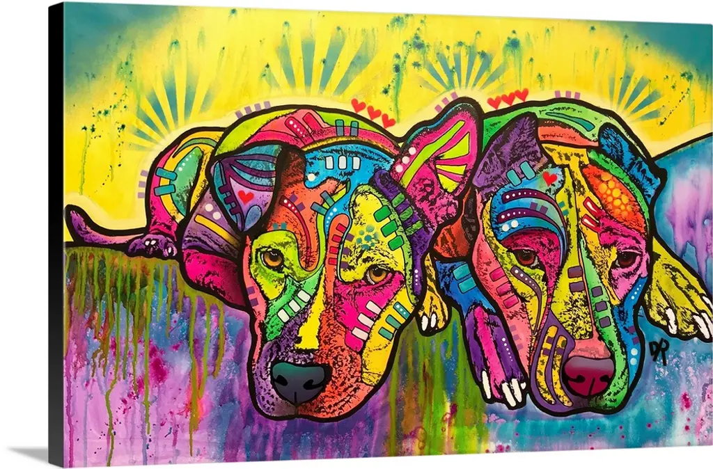 Contemporary stencil painting of a dog filled with various colors and patterns.
