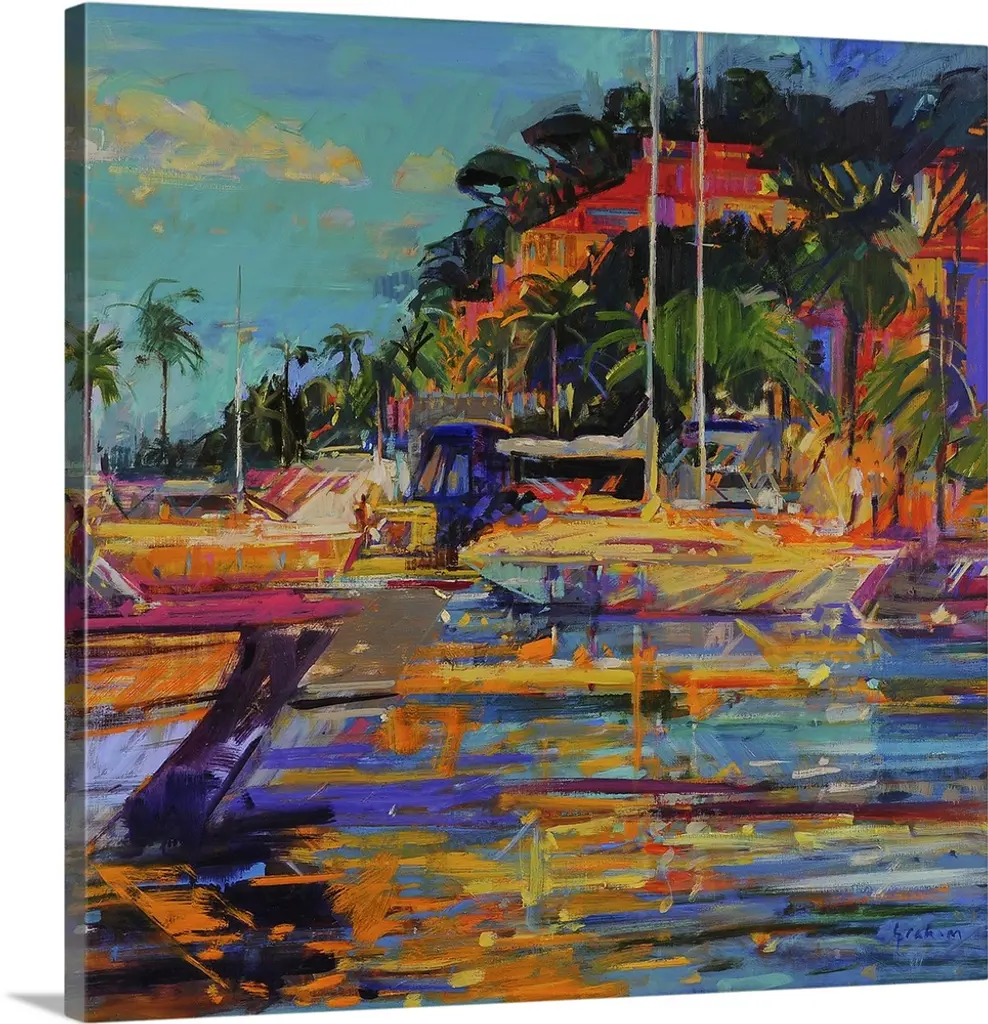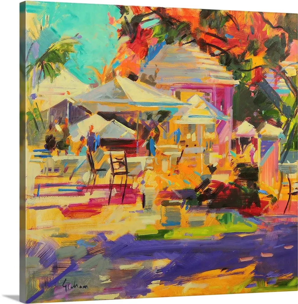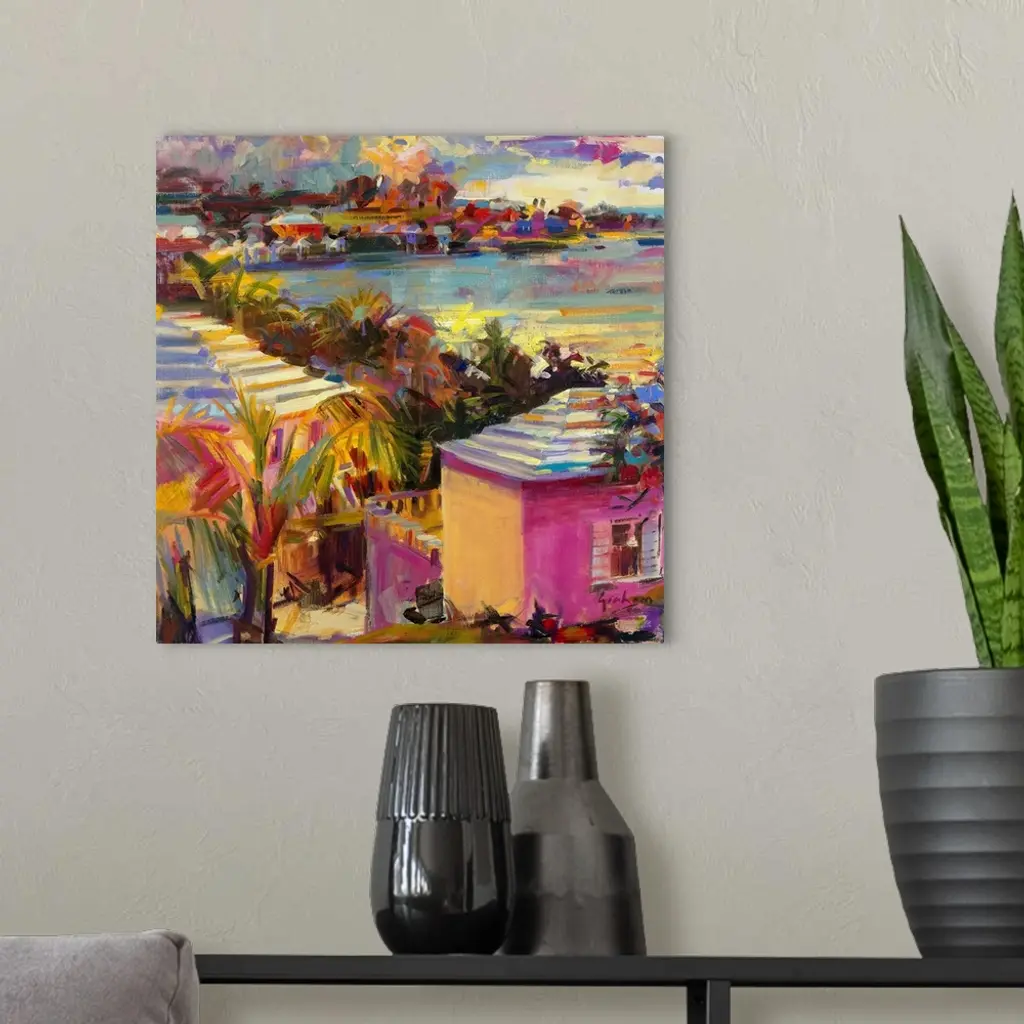 Big, square painting of beach homes surrounded by palm trees, along the coastline in Bermuda. Painted with thick, harsh brushstrokes, with minimal small detail.