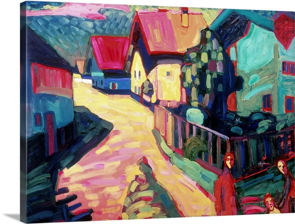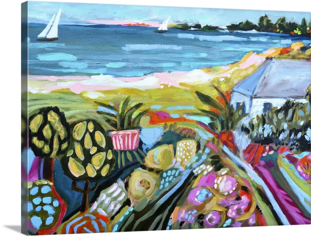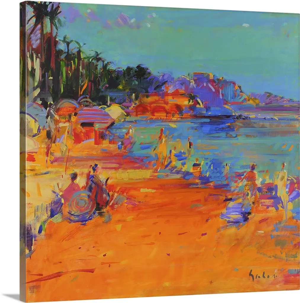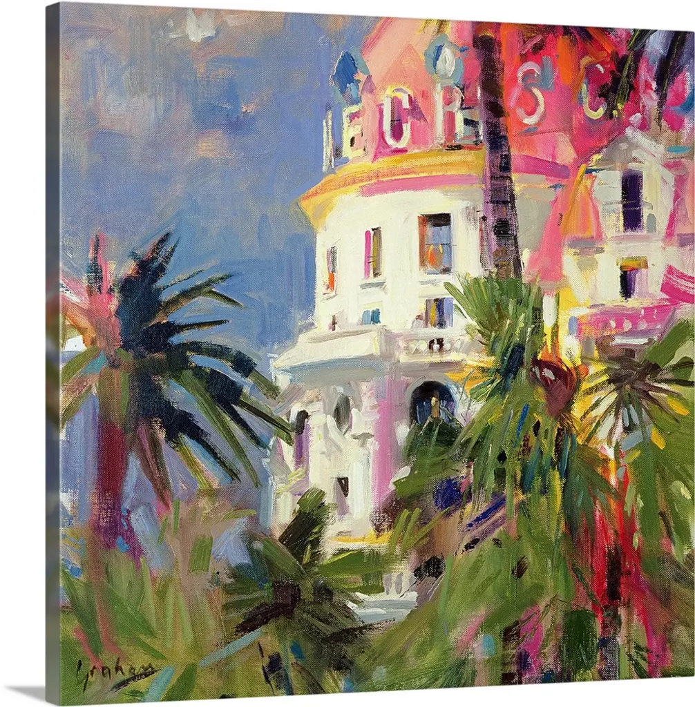 Big, square painting of beach homes surrounded by palm trees, along the coastline in Bermuda. Painted with thick, harsh brushstrokes, with minimal small detail.