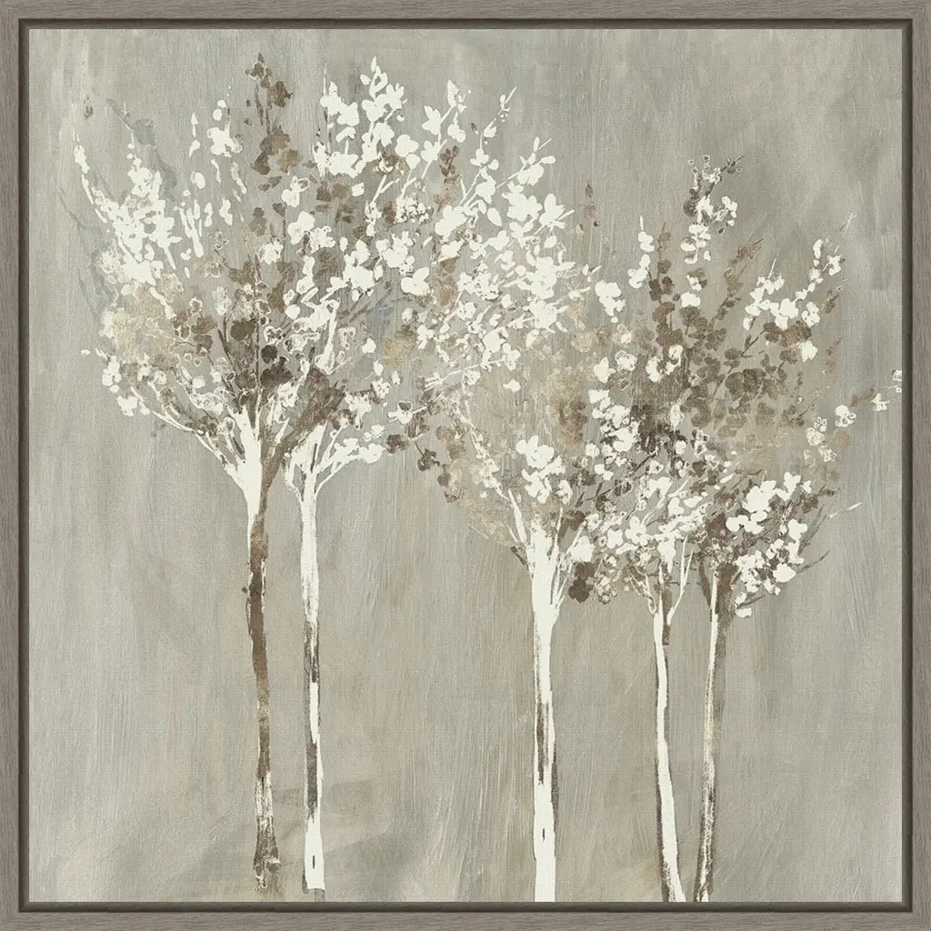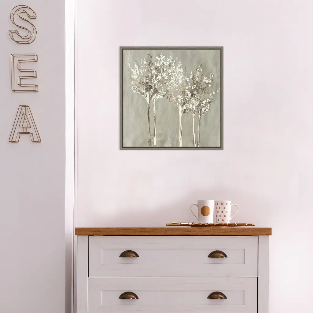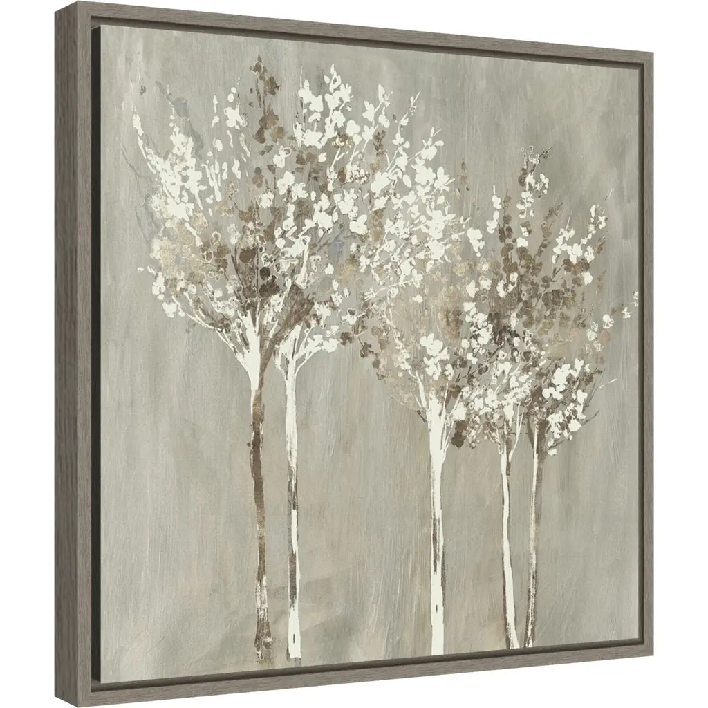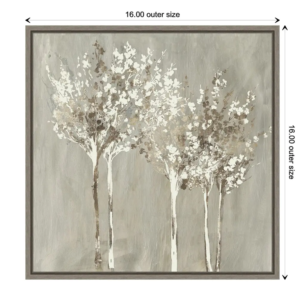 A smattering of trees stands majestic in the dusky twilight within this watercolor piece. Delicate branches are dotted with leaves in tones of white, gray, black and brown. The muted colors add a touch of natural mystery and intrigue to any space.Features:FLOAT FRAMED CANVAS ART: Canvas is framed in a floated style that showcases a narrow gap between the edge of the gallery wrapped canvas and the frame. The wrapped canvas appears as if it's "floating" on the frame. The overall look is clean, modern and upscale.QUALITY: Canvas is printed with high quality, fade-resistant inks and stretched to hide corner folds. Canvas is stretched across a solid surface to resist sagging.AUTHENTICITY: Canvas is printed and professionally framed in Madison, Wisconsin USA with authentically licensed artwork.EFFORTLESS HANGING: Ready to hangfor easy installation. The metal sawtooth hangers come attached on the inset back for easy wall display.CUSTOM PACKAGED: Canvas is custom packaged for protection in shipment to arrive without damage.Details:Artist: Allison PearceTitle: Dusky (Trees)Product type: Framed Canvas BoxStyle: Modern ContemporaryFormat: squareSize: SmallSubject: FloralFrame: Sylvie Greywash .5"Image dimensions: 14.50 inches high x 14.50 inches wideOutside dimensions: 16 inches high x 16 inches wide x 1.875 inches deep