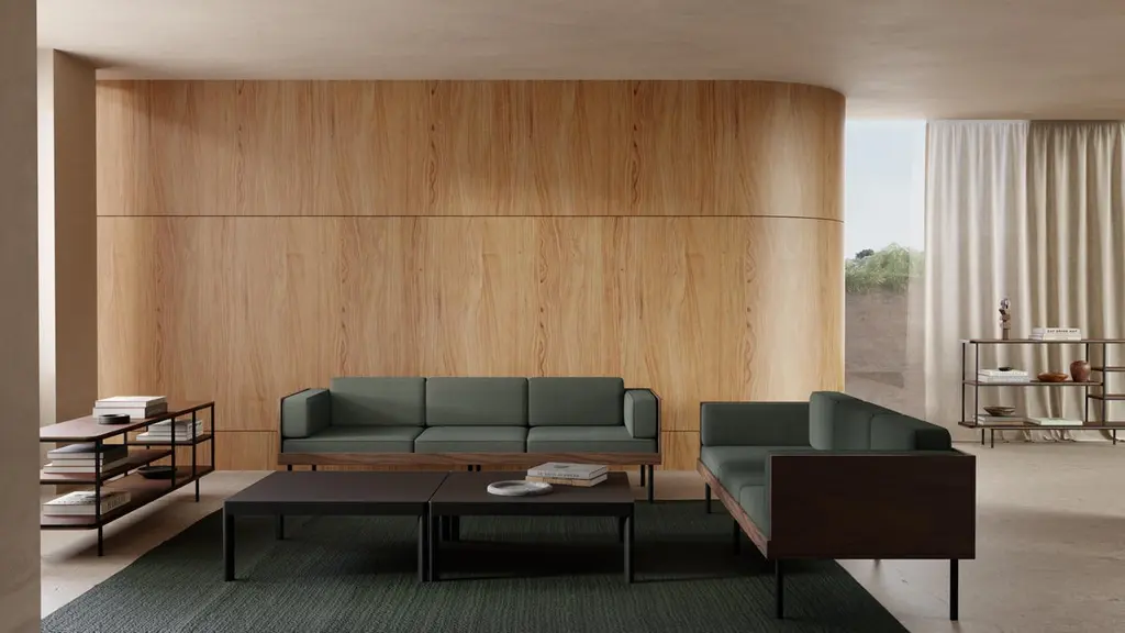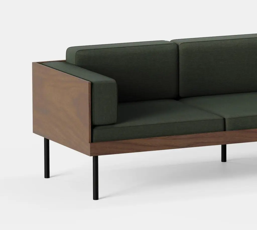 Dusty Green Cut Sofa by Kann DesignDimensions: D 80 x W 230 x H 72 cm.Materials: Solid wood, steel, wood veneer, HR foam, fabric upholstery Kvadrat Canvas 936 (90% wool, 10% nylon).Available in other fabrics.The Cut sofa has a deep, comfortable seat and is characterized on one hand by a walnut wood structure and on the other by thick, removable cushions. Supported by a base with fine lines, the Cut sofa focuses on the airy aspect of the seat.Founded in 2010, Kann Design is a furniture-making brand that brings together the know-how of the Kanaan workshop and the talents of independent designers. Kann’s adventure is above all a family story: what distinguishes it from the rest is the skilled work of the craftsmen of Kanaan, a collective founded in 1958 in Beit Chabab, Lebanon, by the father of Houssam, the founder of Kann Design, himself a cabinetmaker.Since its creation, the studio has shown and gained great skills in cabinetmaking, painting, tapestry, and welding, and since 2017, thanks to Houssam’s brother, Samer Kanaan, the workshops have been modernized and expanded to accommodate Kann’s ever-more ambitious projects, particularly customized orders for specific projects carried out in collaboration with architects.