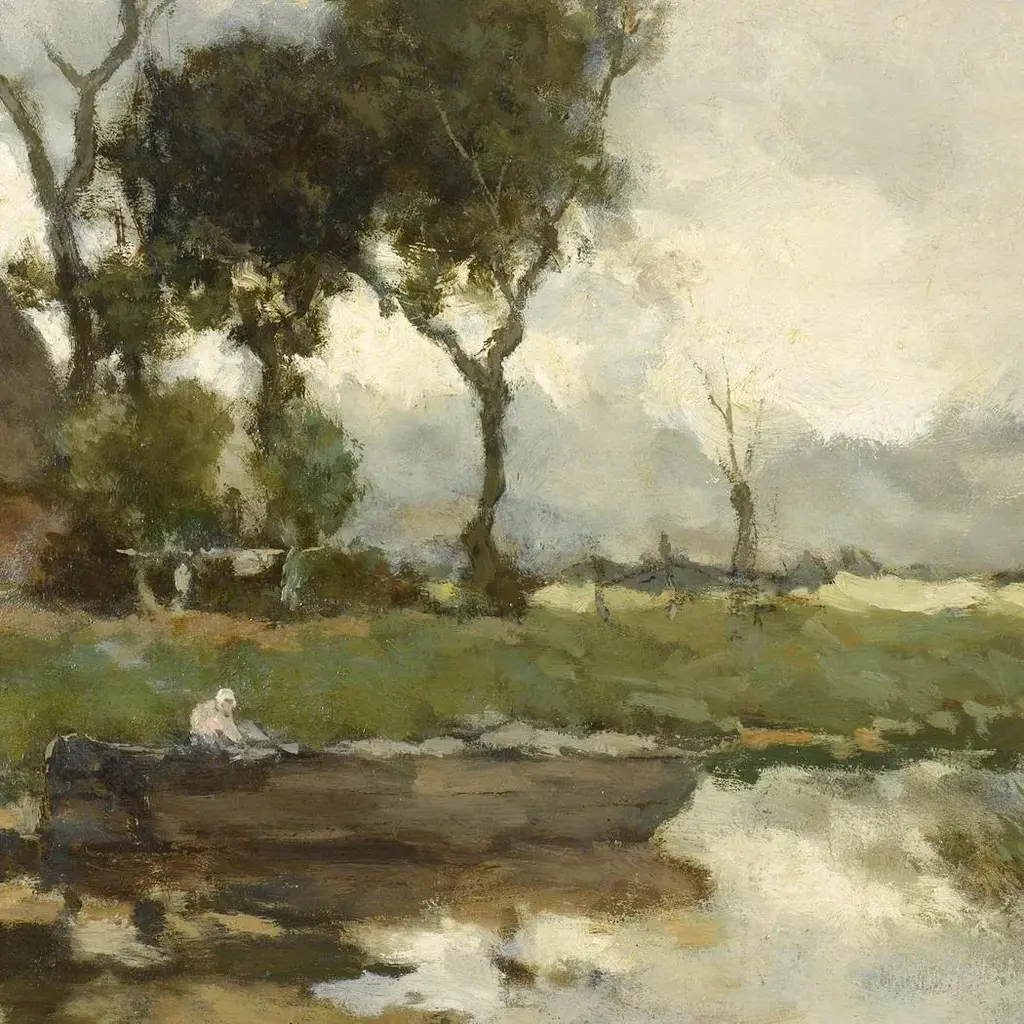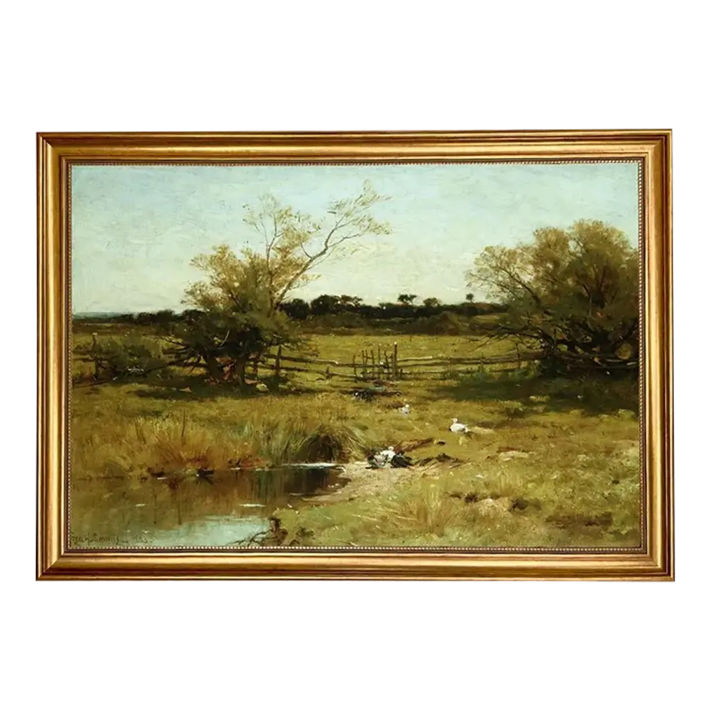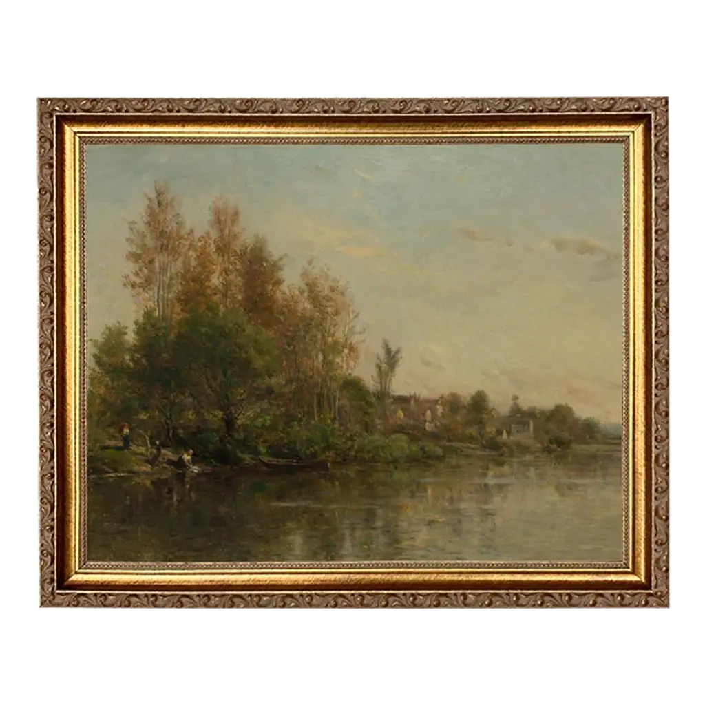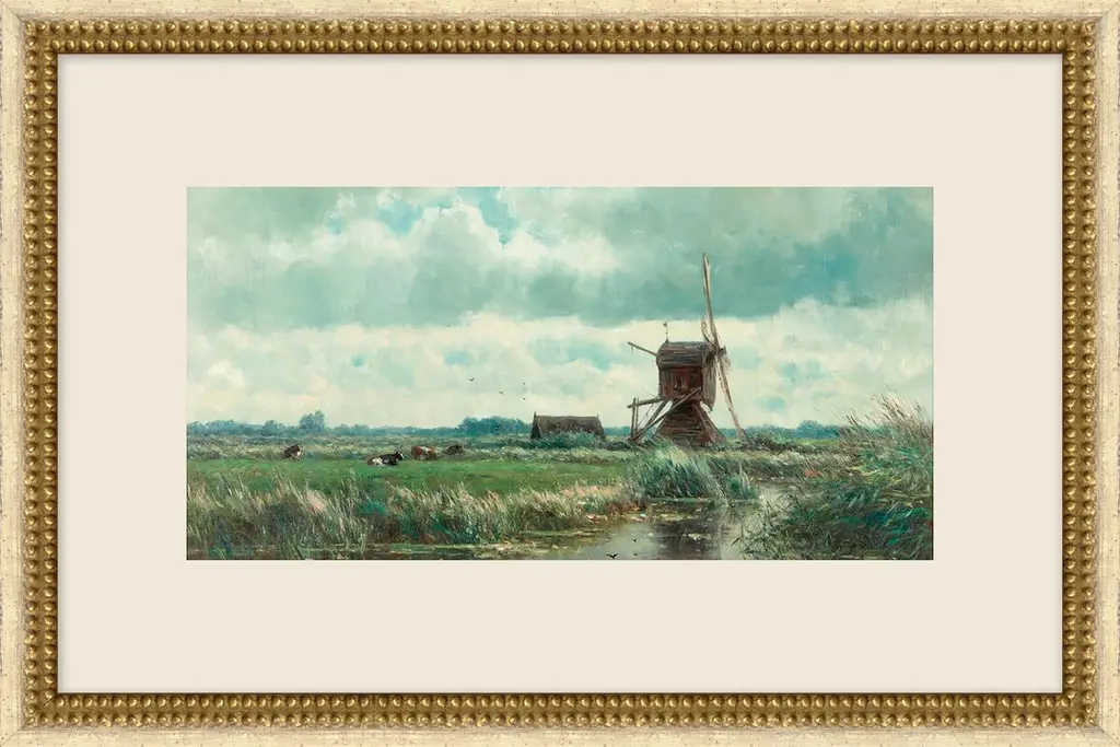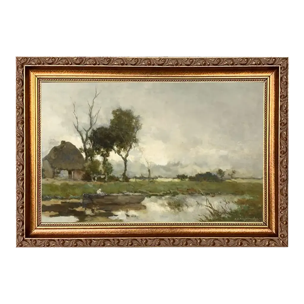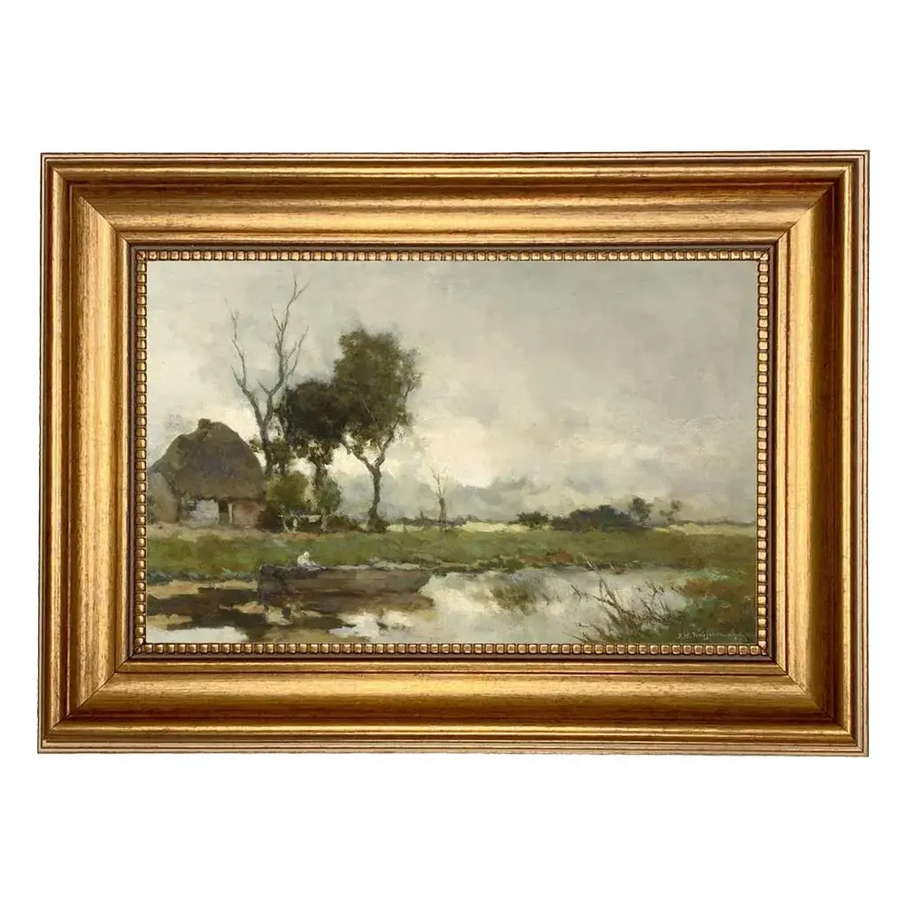 Accurate reproduction print of the original work by Dutch painter J.H. Weissenbruch (1824-1903). Each high-resolution image is printed with archival quality ink on matte canvas, board-mounted, then treated with a special varnish to give it a more authentic oil painting look. Each work is custom framed in an antiqued gold resin frame, and the back is finished with craft paper and a saw tooth hook. Made in the USA. • Painting print: 7" x 11" • Finished frame size: 9-1/2" x 13-1/2" • Frame width: 2" • Frame thickness: 1"