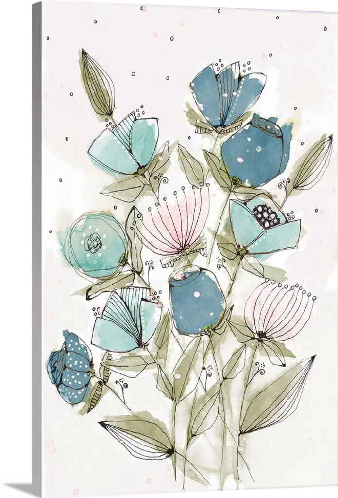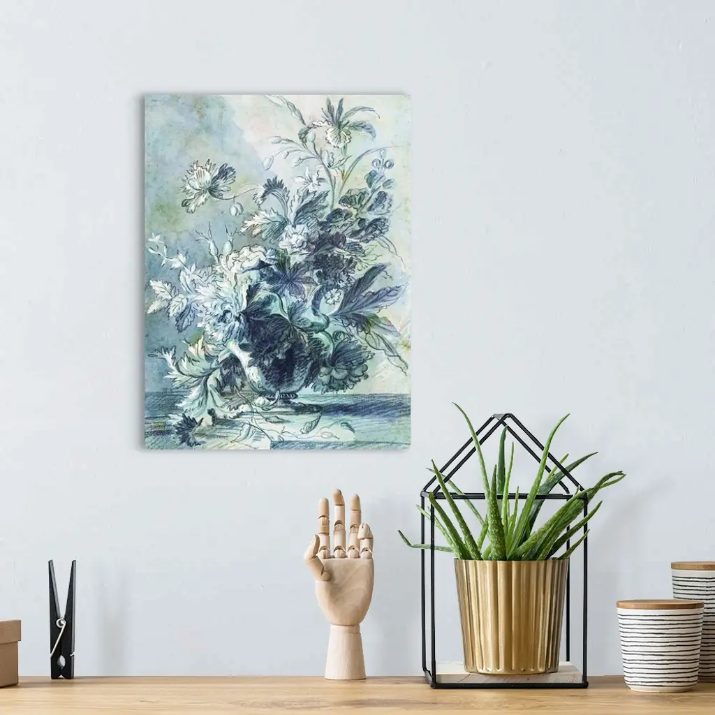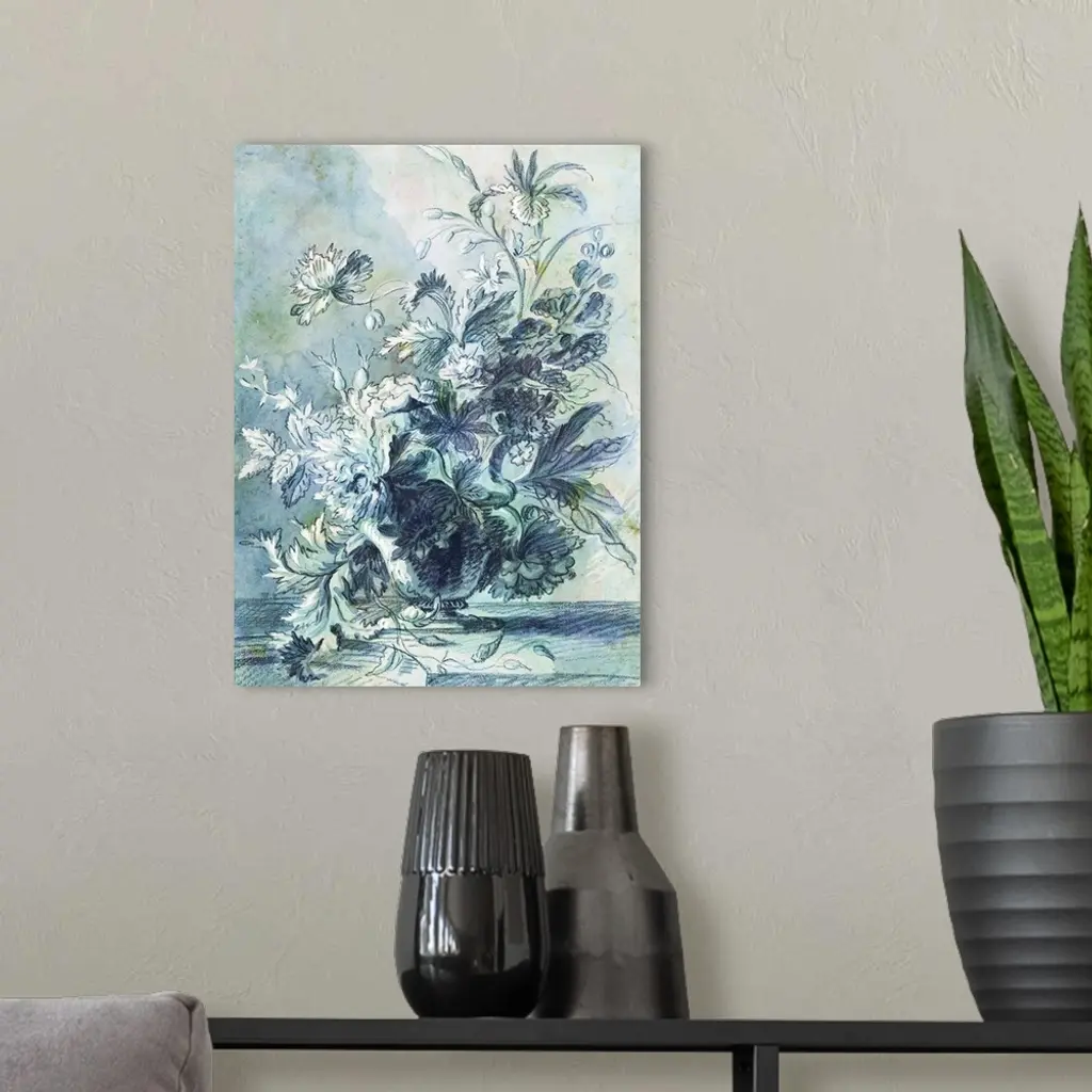 An old world sketch of a floral arrangement in pastel shades of blue and green.