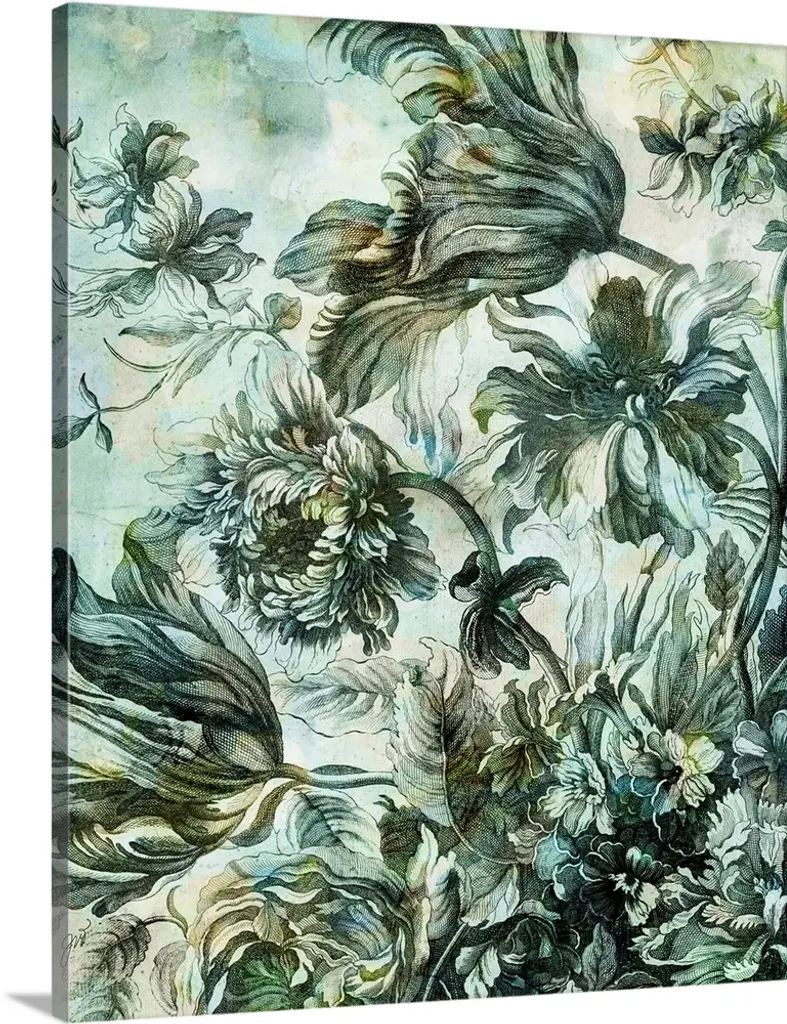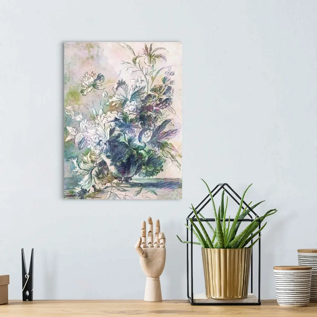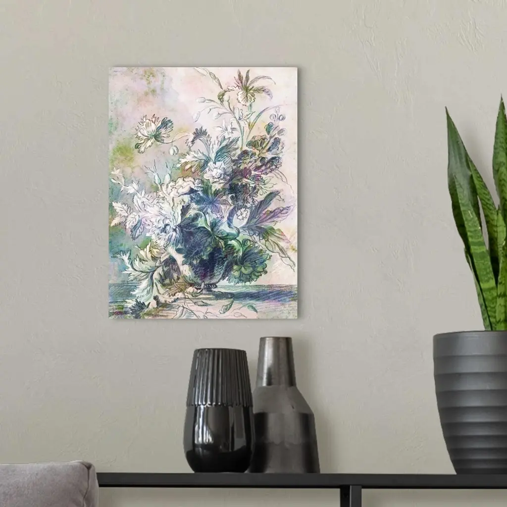 An old world sketch of a floral arrangement in subtle shades of blue and green.