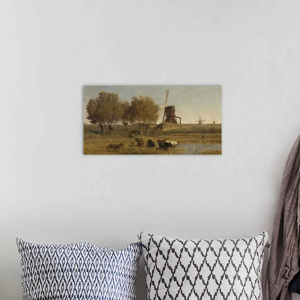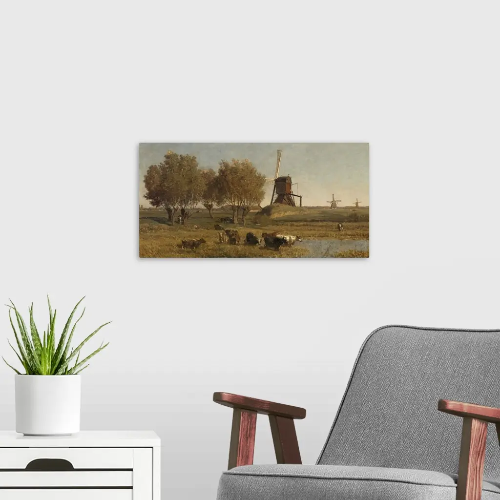 Dutch Polder Landscape near Abcoude, by Paul Gabriel, c. 1877, Dutch painting, oil on canvas. Three windmills are in a line with cows grazing near a pool of water and clump of willows.
