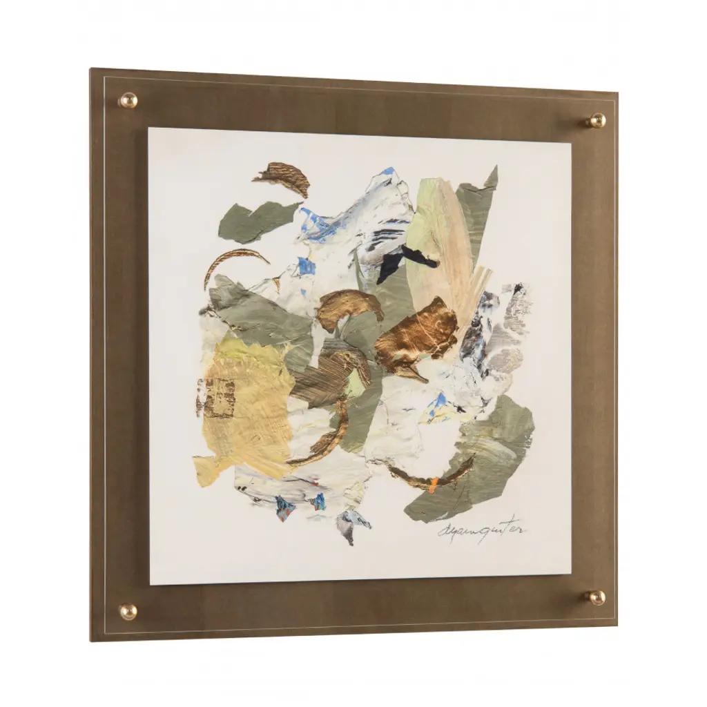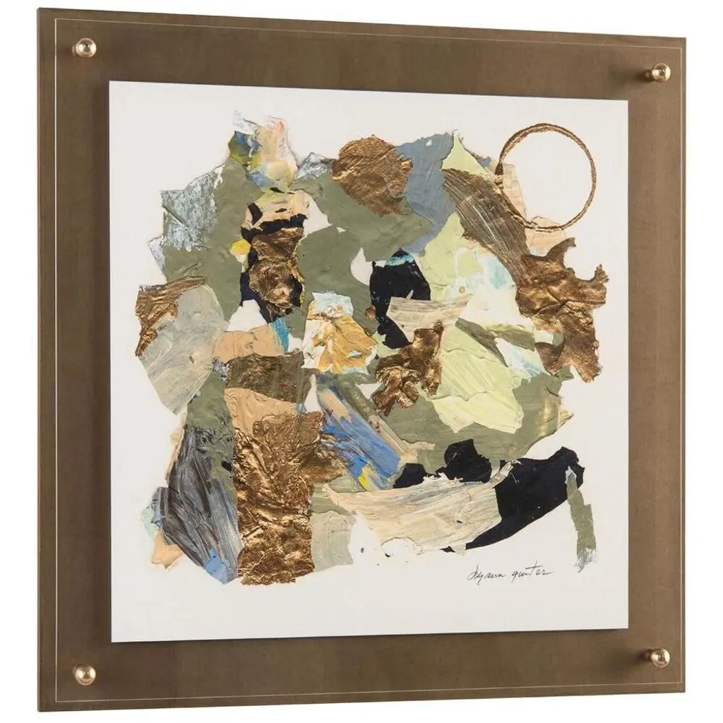 Dyann Gunter's incredible series of collaged color is supported by a rich bronze backer. A modern piece of acrylic is balanced above by a set of gold bolts.