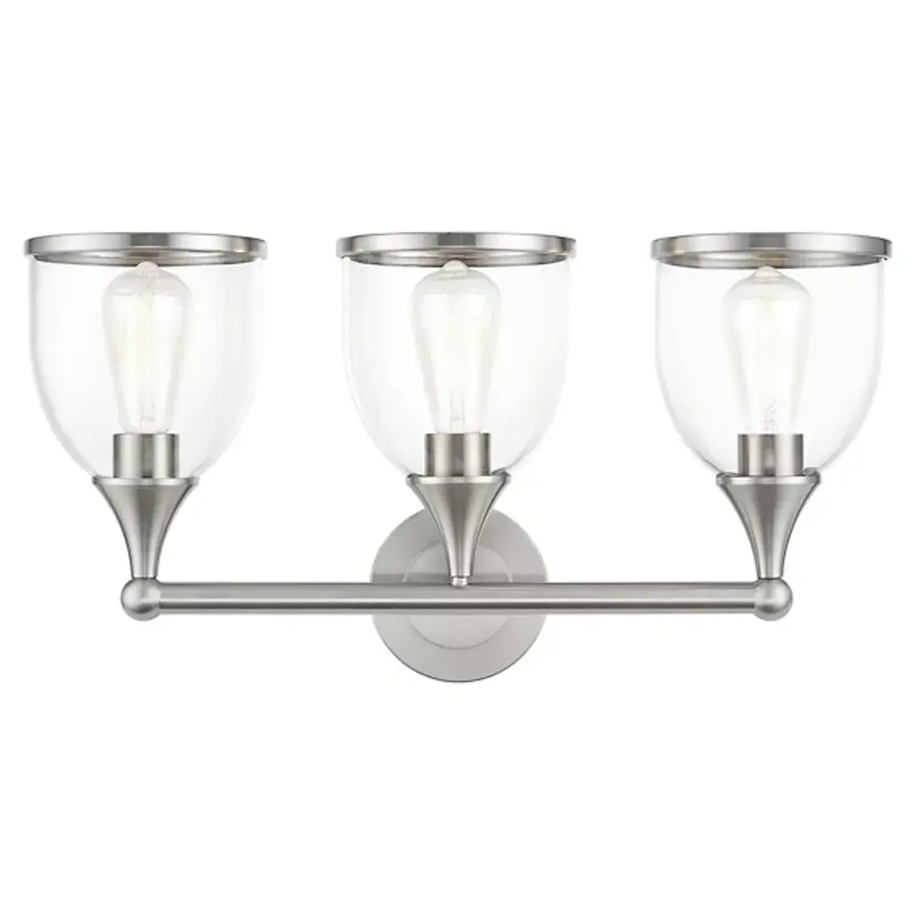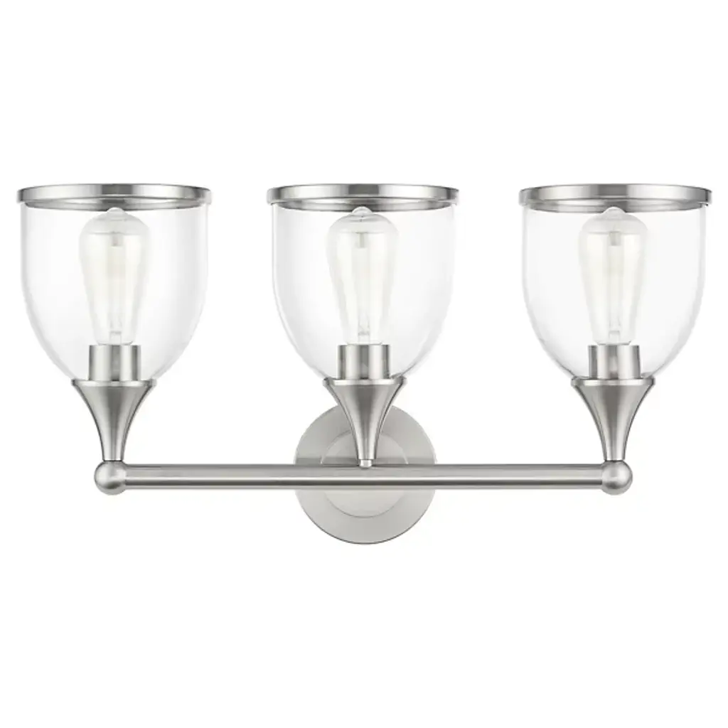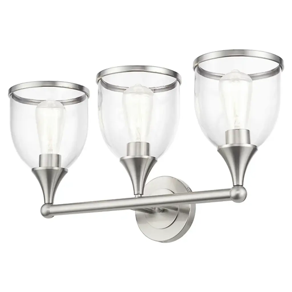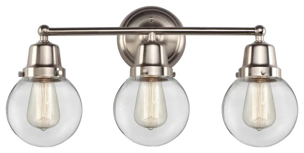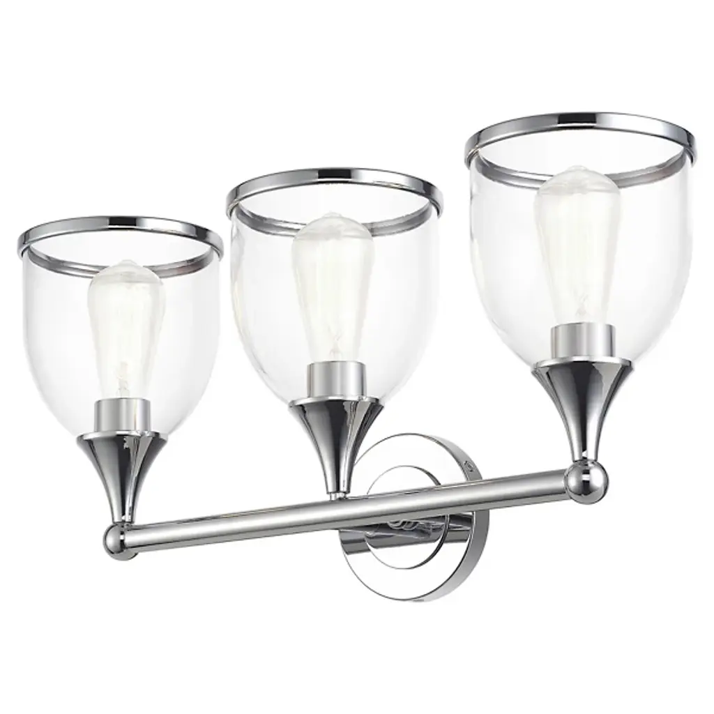 The Dyna Vanity Light from Alder & Ore infuses modern spaces with a touch of vintage sophistication. This transitional fixture features multiple mouth-blown clear glass shades, elegantly framed by metal bands and mounted on a sleek crossbar attached to a stepped circular wall plate. Its versatile design allows for installation above a bathroom mirror, either facing up for ambient light or down for task lighting. The durable steel construction and damp-listed rating ensure both resilience and style, making it a refined choice for more intricate decor.